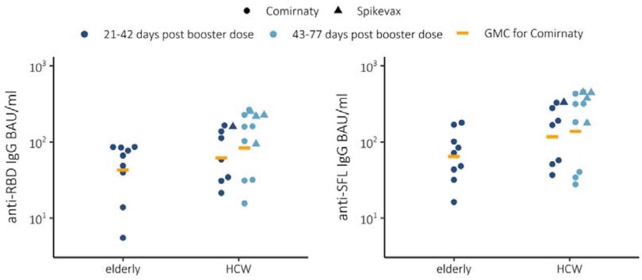 IgG concentrations and geometric mean concentrations (GMC) expressed as BAU/ml for spike proteins (SFL and RBD) in elderly (n=9) and health care workers (HCW) 21-42 (n=8) or 43-77 (n=12) days post booster mRNA vaccination (3rd dose) using Comirnaty. Booster mRNA vaccination Spikevax vaccinated HCWs 21-42 (n=1) and 43-77 (n=4).