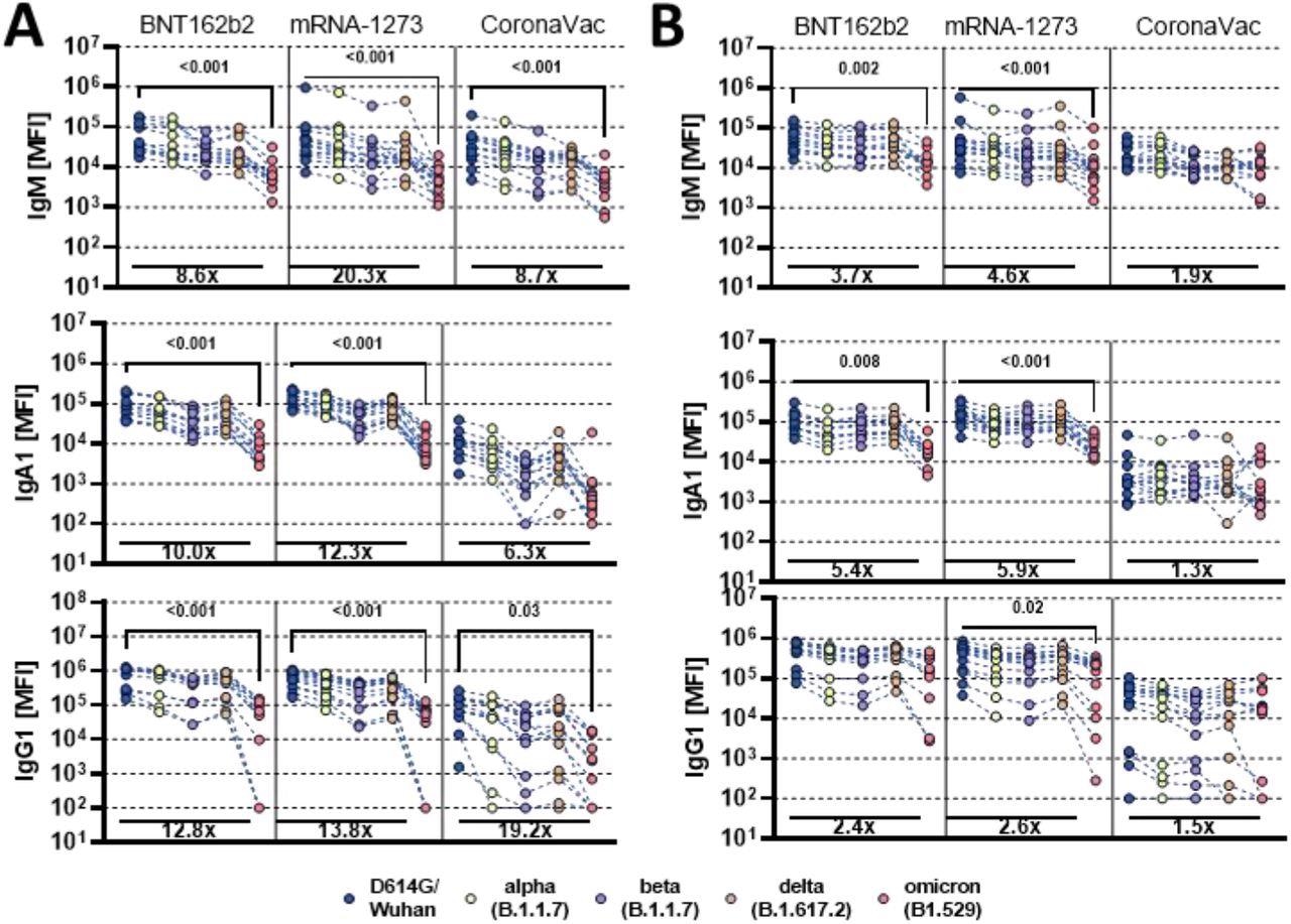 Vaccine-induced antibody binding to different SARS-CoV-2 variants of concern. Individuals either received the full dose regimen of the BNT162b2(n = 11), mRNA-1273(n=14), or the aluminum adjuvanted inactivated particle vaccine CoronaVac (n=13). Samples were taken at peak immunogenicity 2 weeks after the last dose. IgM, IgA1 and IgG1 binding titers to D614G (WT), Alpha (B1.117), Beta (B1.351), Delta (B.1.617.2), and Omicron (B1.529) variants of concern receptor-binding domain (A) or full Spike (B) were measured by Luminex. Background corrected data is shown and negative values were set to 100 for graphing purposes. A Kruskal-Wallis test with a Benjamini-Hochberg post-test correcting for multiple comparisons was used to test for statistical differences between wildtype variant and omicron titer. P-values for significant different features are shown above and fold change reduction of omicron titer compared to wildtype below each dataset.
