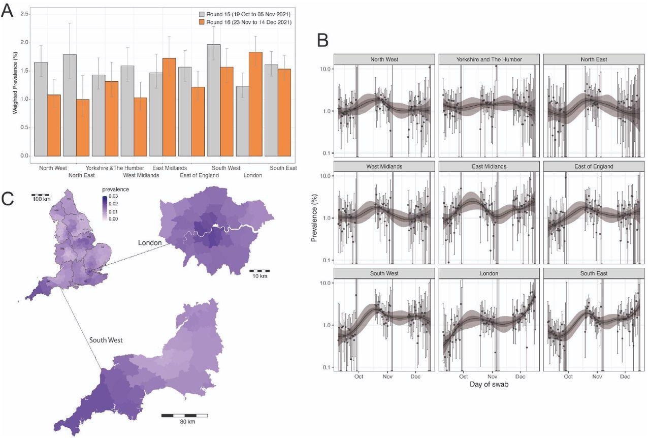 (A) Weighted prevalence of swab positivity by region for round 15 and round 16. Bars represent prevalence point estimates (grey for round 15 and orange for round 16), and the vertical lines the corresponding 95% confidence intervals. (B) P-spline models fit to all rounds of REACT-1 for each of the nine regions separately. Shown here only for the period of round 14, round 15 and round 16. Shaded regions show 50% (dark shade) and 95% (light shade) posterior credible interval for the P-spline models. (C) Neighborhood smoothed average prevalence by lower-tier local authority area for round 16. Neighborhood prevalence was calculated from nearest neighbors (the median number of neighbors within 30 km in the study). Average neighborhood prevalence displayed for individual lower-tier local authorities for the whole of England and for South East, South West and London. Regions: NE = North East, NW = North West, YH = Yorkshire and The Humber, EM = East Midlands, WM = West Midlands, EE = East of England, L = London, SE = South East, SW = South West