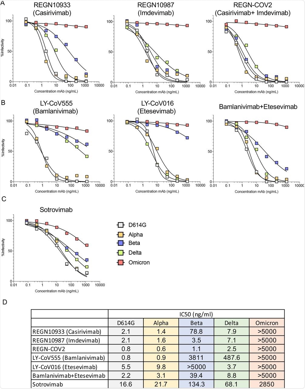 While all MAbs and MAb cocktails investigated in this study showed weak or no activity against the Omicron variant, VIR-7831 (Sotrovimab) was active against Omicron with its inhibitory concentration of 50% (IC50) that was about 172-fold lower than against D614G. Although its neutralizing activity decreased in treated patients, VIR-7831 achieved an antibody concentration of 24 μg/ml following a 500 mg dose. It is worth noting that a decreased MAb inhibitory activity increases the IC50.