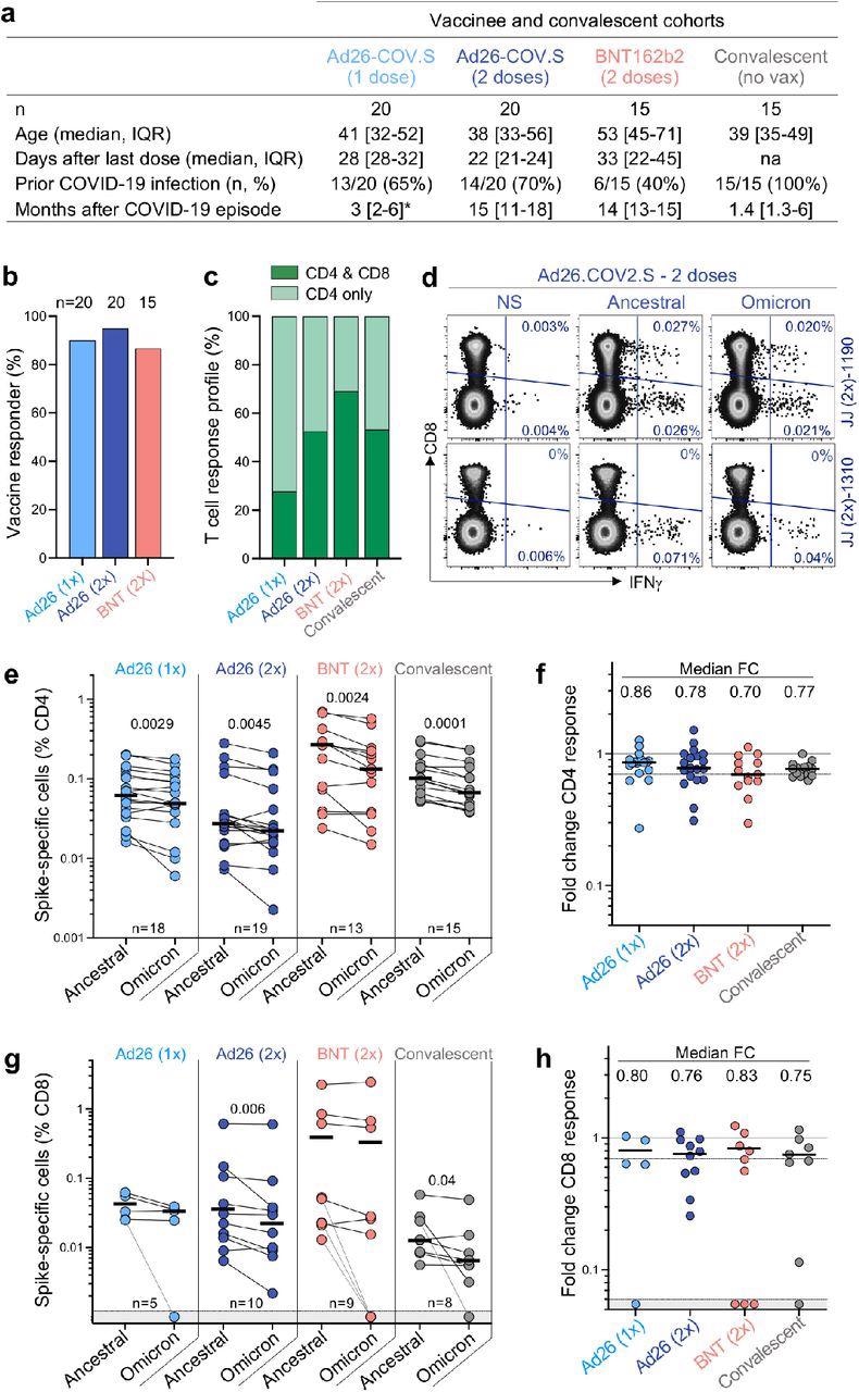 T cell response to the ancestral and Omicron SARS-CoV-2 spike after vaccination and in unvaccinated COVID-19 convalescent patients. a, Clinical characteristics of the study groups. *: data regarding time post-Covid-19 infection were available for only 6 out of the 13 participants who received one dose of Ad26.COV2.S. b, Proportion of participants exhibiting an ancestral spike-specific CD4 T cell response after vaccination with one or two doses of Ad26.COV2.S or two doses of BNT162b2. c, Profile of the ancestral spike-specific T cell response in vaccinees and convalescent individuals. d, Representative examples of IFN-γ production in response to ancestral and Omicron spike in two individuals who received two doses of Ad26.COV2.S. e,g, Frequency of spike-specific CD4 (e) and CD8 T cells (g) producing any of the measured cytokines (IFN-γ, IL-2 or TNF-α) in response to ancestral and Omicron spike peptide pools. Bars represent the median of responders. Differences between SARS-CoV-2 variants were calculated using a Wilcoxon paired t-test. f, h, Fold change in the frequency of spike-specific CD4 (f) and CD8 T cells (h) between ancestral and Omicron spike responses. Bars represent medians. No significant differences were observed between groups using a Kruskal-Wallis test with Dunn’s multiple comparisons post-test. The number of participants included in each analysis is indicated on the graphs.
