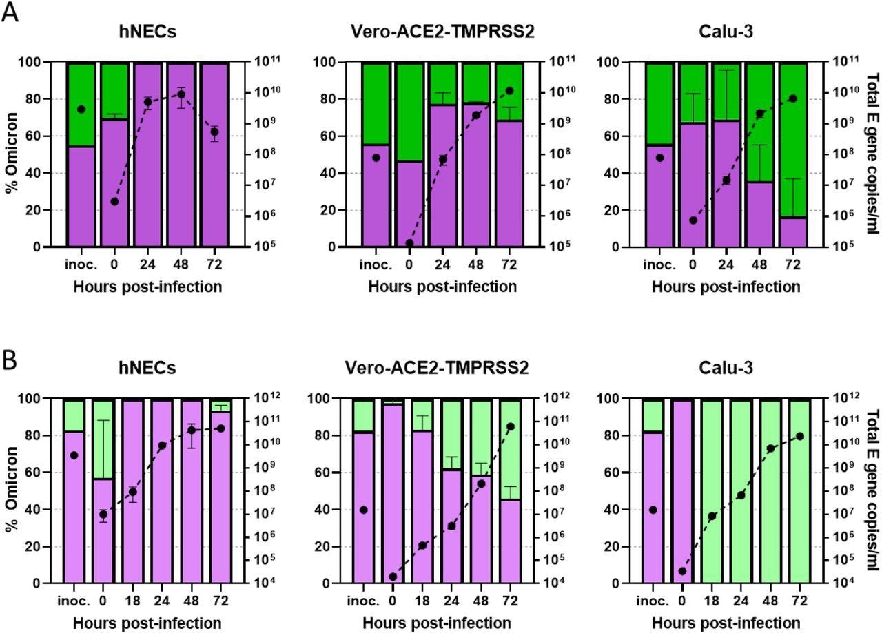 Competition assays between Delta and Omicron isolates. (A,B) Competition assay between SARS-CoV-2 Omicron (Purple) and Delta (Green) isolates in vitro and ex vivo. A probe-based RT-qPCR assay was developed to measure the proportion of Omicron and Delta present in mixed samples (see Supplementary Figure S1). The proportion of variant-specific signal is shown with the SD of 3 replicates. (A) Equal mixtures or (B) an 8:2 ratio of Omicron and Delta isolates were inoculated onto hNECs at a final multiplicity of 0.1 pfu/cell and onto Vero-AT and Calu-3 cells at 0.001 pfu/cell. Daily harvests were measured for total viral load by E gene qRT-PCR (black dots) and by the variant-specific RT-qPCR to give variant proportions. Mean + s.d. of 3 replicates shown. (A) Shows competition assay specifically between BA.1 (Spike A701V) and a B.1.617.2 isolate while (B) shows competition between a different BA.1 isolate (lacking A701V) an AY.4.2 isolate.