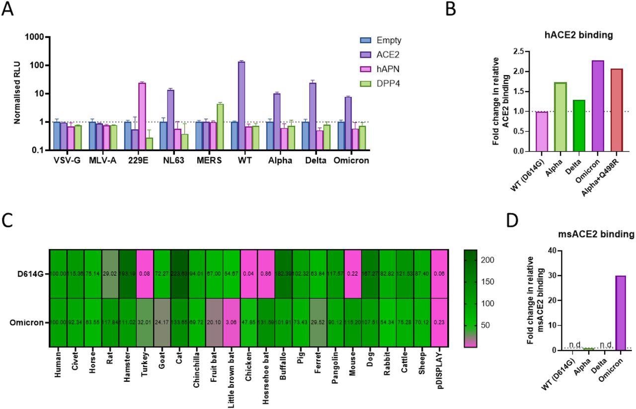 Use of common coronavirus protein receptors and receptor species specificity for SARS-CoV-2 variant entry. (A) Entry of pseudotyped lentiviruses expressing different viral glycoproteins was assessed into 293Ts transfected with different coronavirus protein receptors. 229E and MERS Spike protein pseudotypes were used as controls for hAPN and DPP4 mediated entry. All assays were performed in triplicate and are plotted as mean + s.d. (B, D) HEK 293T cells expressing whole SARS-CoV-2 Spike were incubated with recombinant (B) hACE2-Fc(IgG) for 30 minutes or (D) mouse ACE2-Fc(IgG) overnight, washed and incubated with Goat Anti-Human IgG Fc (DyLight® 650) secondary for 30 minutes, before washing and analysis by flow cytometry. Relative differences in median fluorescence intensity are shown. ‘n.d.’ indicates not detected. (C) Receptor usage was screened using pseudoviruses expressing the indicated Spike proteins into BHK-21 cells expressing the indicated ACE2 protein. Viral entry was measured by assaying luciferase activity (RLU) using the BrightGlo reagent (Promega).