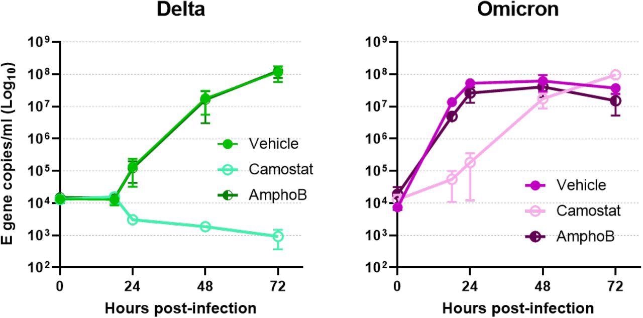 Cell entry mechanism of live Omicron virus in primary cells. Comparative replication kinetics of SARS-CoV-2 Omicron and Delta variants in primary human nasal epithelial cultures (hNECs) inoculated with Delta or Omicron variants at 0.1 pfu/cell. Cells were pretreated both basolaterally and apically with either with no drug, or with 50 µM of Camostat or Amphotericin B for 2 hours prior to infection. 50µM of Camostat or Amphotericin B remained in the basolateral media for the course of the experiment. Infections were performed in triplicate wells and back titration confirmed equal inputs of the variants by E gene copies measured by RT-qPCR and infectious units measured by plaque assay. Plotted as mean ± s.d.