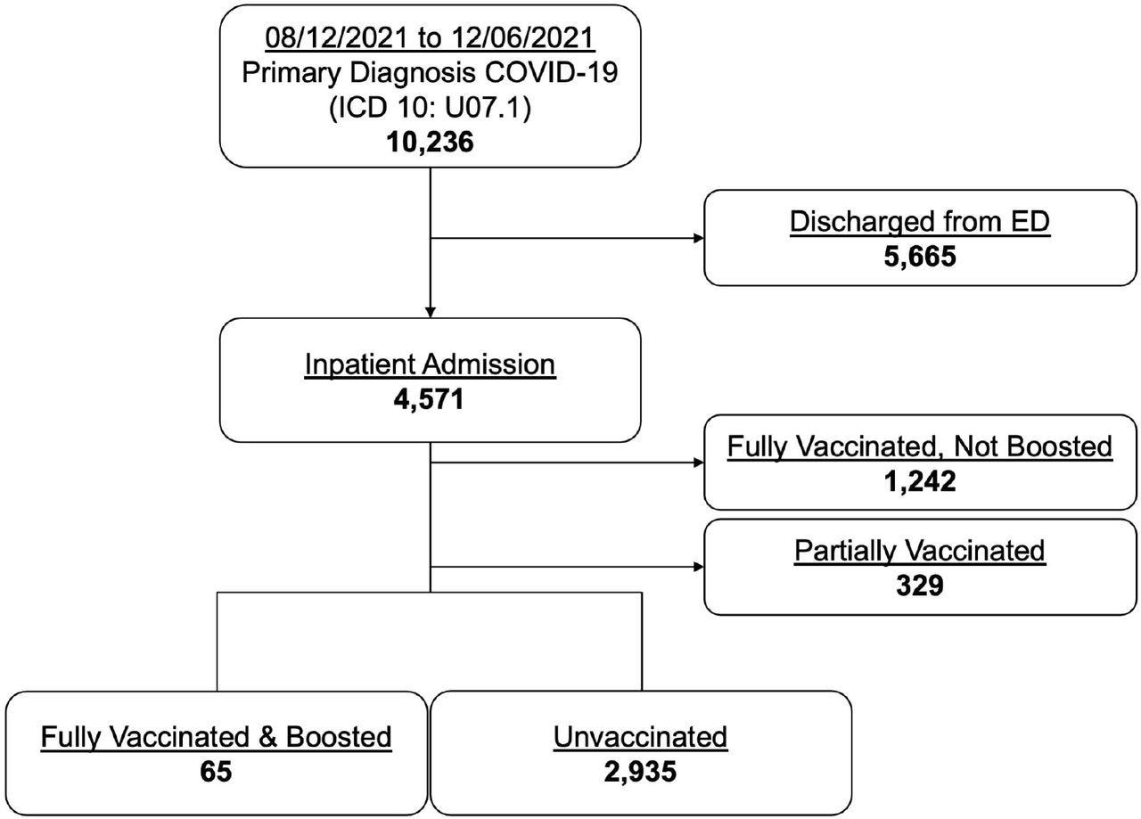 Between August 12, 2021, and December 6, 2021, 10,236 ED encounters with a primary diagnosis of COVID-19 were observed. Among these, encounters discharged from the ED, fully vaccinated but not boosted encounters, and partially vaccinated encounters were excluded from the study. Out of the remaining cases, 2.2% were FV&B and 97.8% were UV.