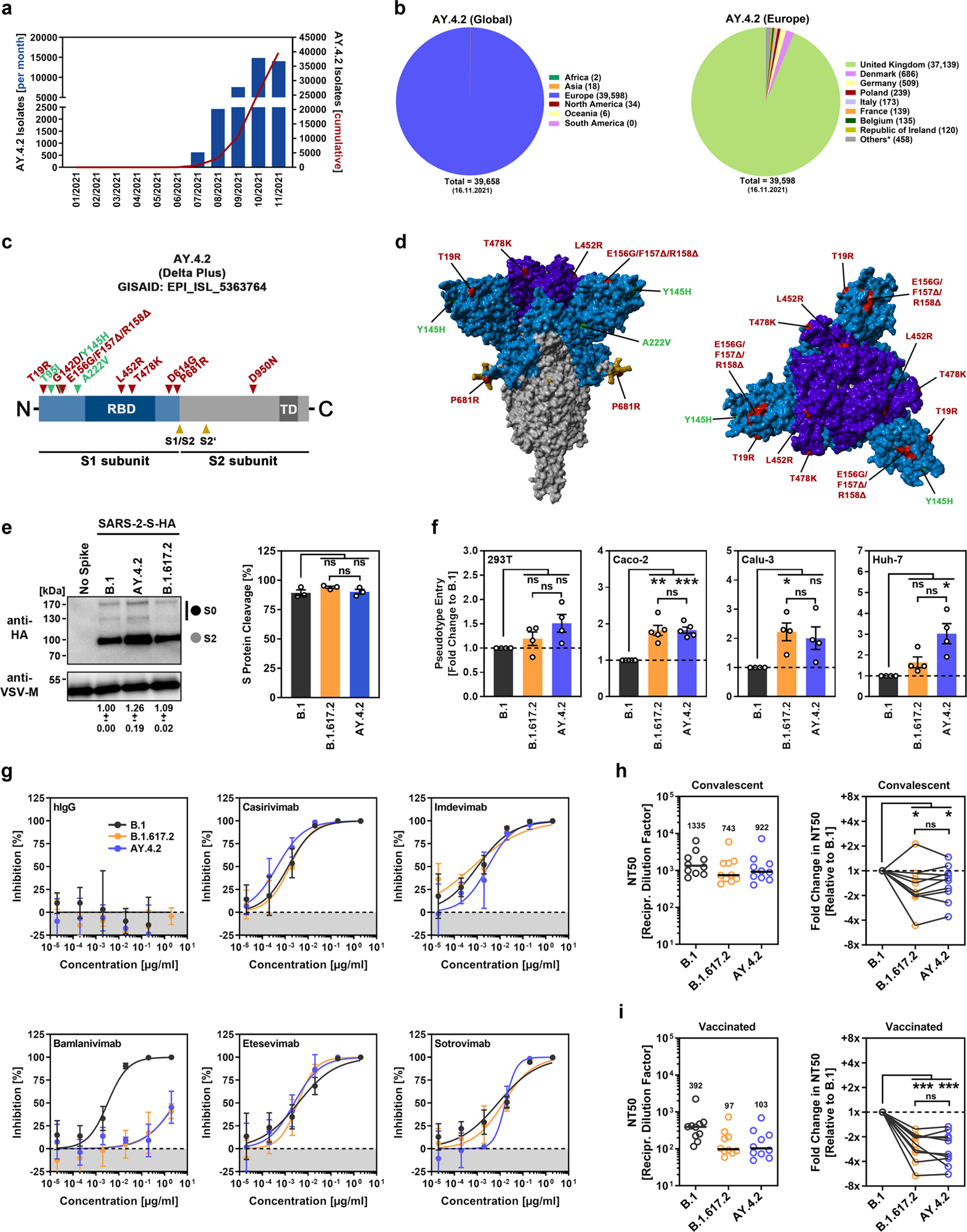a Monthly and cumulative numbers of globally reported AY.4.2 isolates. b Distribution of reported AY.4.2 isolates at the global (left) and European (right) levels. Numerical values in brackets indicate the number of isolates per country (* = twenty countries with < 100 isolates). c Schematic illustration of the SARS-CoV-2 spike protein in which the locations of functional domains (RBD, receptor binding domain; TD, transmembrane domain) and cleavage sites (S1/S2 and S2’) are highlighted. Mutations found in the spike protein of B.1.617.2 (Delta variant, EPI_ISL_1921353) are highlighted in red, while the additional mutations found in the Delta sublineage AY.4.2 (EPI_ISL_5633764) are highlighted in green. d Location of the amino acid changes in the context of the trimeric spike protein. e Pseudotyped particles bearing the indicated S proteins (equipped with a C-terminal HA epitope tag) were subjected to immunoblot analysis to analyze S protein incorporation and cleavage. S proteins and VSV-M (loading control) were detected using anti-HA and anti-VSV-M antibodies, respectively, in combination with a peroxidase-conjugated anti-mouse secondary antibody. The results from a single experiment are presented, and the results were confirmed in two additional experiments. For quantification of S protein incorporation, in all experiments, the S protein signals were first normalized against the corresponding VSV-M signals, and further incorporation of B.1 S protein was set as 1 (data represent the mean ± standard deviation, SD). For quantification of S protein cleavage, total S protein signals (bands representing unprocessed [S0] and processed [S2] S protein) for each S protein were set as 100%, and the respective proportions of S0 and S2 were calculated. Statistical significance was assessed by two-tailed Student’s t test with Welch’s correction; p > 0.05, not significant [ns]). f Four different human cell lines were inoculated with pseudotyped particles bearing the indicated spike proteins. At 16–18 h postinoculation, particle entry efficiency was analyzed by measuring the activity of virus-encoded luciferase in cell lysates. Presented are the average (mean) data from 4–5 independent experiments (each performed with four technical replicates) for which particle entry driven by the B.1 spike protein was set as 1. Error bars indicate the standard error of the mean. Statistical significance was assessed by two-tailed Student’s t-test with Welch’s correction (p > 0.05, ns; p ≤ 0.05, *; p ≤ 0.01, **; p ≤ 0.001, ***; please see also Supplemental information, Fig. S1a). g Pseudotyped vectors bearing the indicated spike proteins were incubated (30 min, 37 °C) in the presence of different concentrations of monoclonal antibody or medium alone (control) before being added to Vero cells. Vector entry efficiency was analyzed at 16–18 h postinoculation and normalized against the respective control (set as 0% inhibition). Presented are the average (mean) data for a single experiment (with four technical replicates). The data were confirmed in a separate experiment. Error bars indicate the SD. Curves were calculated using a nonlinear regression model (variable slope). h Pseudotyped vectors bearing the indicated spike proteins were incubated (30 min, 37 °C) in the presence of different dilutions of convalescent plasma or only medium (control) before being added to Vero cells. Vector entry efficiency was analyzed at 16–18 h postinoculation and normalized to the respective control (set as 0% inhibition, please see Supplemental information, Fig. S1b for individual data). Furthermore, the plasma dilution that causes a reduction of 50% in vector entry (neutralizing titer 50, NT50) was calculated. Presented are the combined data for 10 convalescent plasma (each analyzed in four technical replicates). Black lines and numerical values indicate the median NT50. In addition, the data were normalized to reflect the relative change in neutralization sensitivity with the neutralization of B.1 spike serving as reference (set as 1, identical plasma are connected by lines). Statistical significance was assessed by Kruskal–Wallis analysis with Dunn’s multiple comparison test (p > 0.05, ns; p ≤ 0.05, *; p ≤ 0.001, ***). i The experiment was performed as described in (h), but serum from vaccinated individuals (BNT162b2/BNT162b2, n = 10) was analyzed.