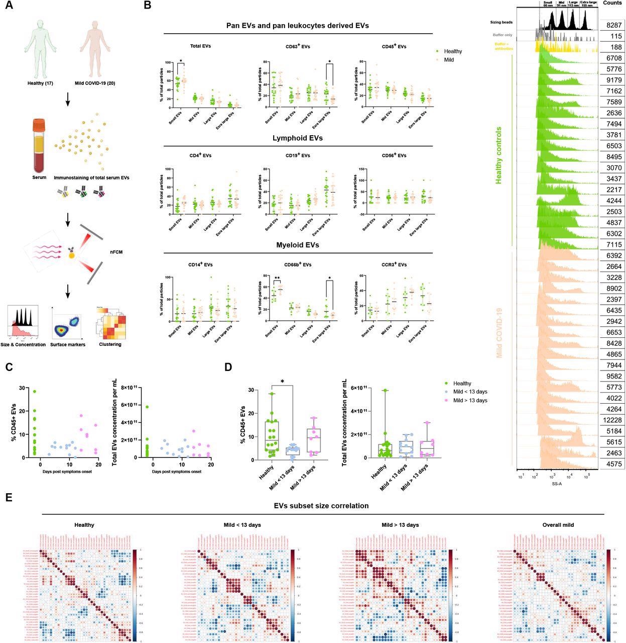 Characterization of immune serum EVs in healthy controls and mild COVID-19 patients. (A) Schematic outline of EVs profiling from denoted human samples. (B) Size distribution quantification of serum EVs from denoted human samples and different EV subsets, with size reference beads with a mixture of four modal sizes of 66 nm (small), 91 nm (medium), 113 nm (large), 155 nm (extra-large). Representative side scatter histogram of size reference beads in (B) and total serum EVs from denoted human samples on the right. (C, D) Quantification of total serum EVs and CD45+ EVs in denoted human samples at days of reported symptom onset. (E) Spearman’s rank correlation matrix of size distribution of serum EVs subsets between healthy donors and mild COVID-19 patients. One-way ANOVA, p < 0.05 *, p < 0.01 **, p < 0.005 ***.