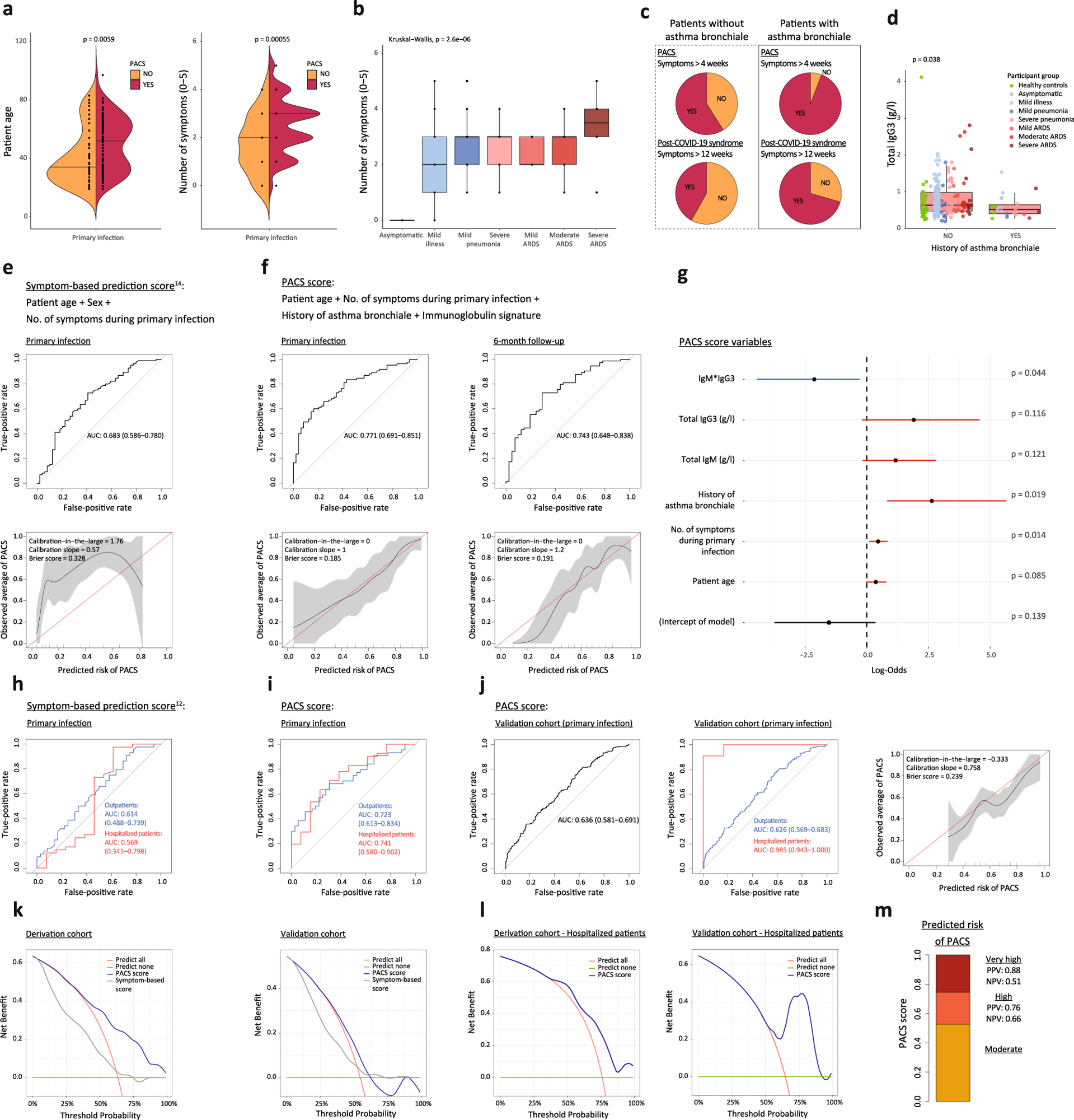 a Age and number of symptoms during primary infection (0–5; fever, fatigue, cough, dyspnea, gastrointestinal symptoms) in patients without or with PACS. b Number of symptoms during primary infection in COVID-19 patients with different disease severities (n = 134, with 85 having PACS). c PACS and post-COVID-19 syndrome in patients without and with history of asthma bronchiale. d IgG3 titers in healthy controls (green symbols) and all COVID-19 patients (n = 215; disease severity indicated by colors) at primary infection, without or with history of asthma bronchiale. e and f Receiver operating characteristic (ROC) curves (top) and calibration plots (bottom) reporting the area under the curve (AUC) with 95% confidence intervals (CI) or calibration-in-the-large, calibration slopes, and Brier scores of logistic regression models for predicting PACS. Use of (e) a symptom-based model14 and (f) the PACS score on data of our patient cohort at primary infection (e and f, left; n = 134, with 85 having PACS) and after shrinkage of coefficients on 6-month follow-up-data (f, right; n = 115, with 74 having PACS). g Regression coefficients of PACS score with 95% CI and p values. h and i ROC curves reporting AUC with CI of PACS score in outpatients (blue) and hospitalized patients (red) of derivation cohort (n = 80 and 54, with 44 and 41 having PACS, respectively). j Validation of PACS score in independent cohort at primary infection (n = 389, with 212 having PACS) and subgroup analysis in outpatients (blue; n = 372, with 201 having PACS) and hospitalized patients (red; n = 17, with 11 having PACS). k Decision curve analysis of PACS score in derivation (left) and validation cohort (right) comparing the PACS score to a symptom-based score14 and clinical strategies of predicting none or all subjects with COVID-19 develop PACS. l Decision curve analysis of PACS score in hospitalized patients. m Estimated risk groups based on two probability thresholds (0.523 and 0.746) with corresponding positive (PPV) and negative (NPV) predictive values in the derivation cohort. Boxplots represent median (middle line) with upper and lower quartiles (box limits), and 1.5*interquartile ranges (whiskers). Variables were compared using a two-sided Wilcoxon’s test if not specified otherwise.