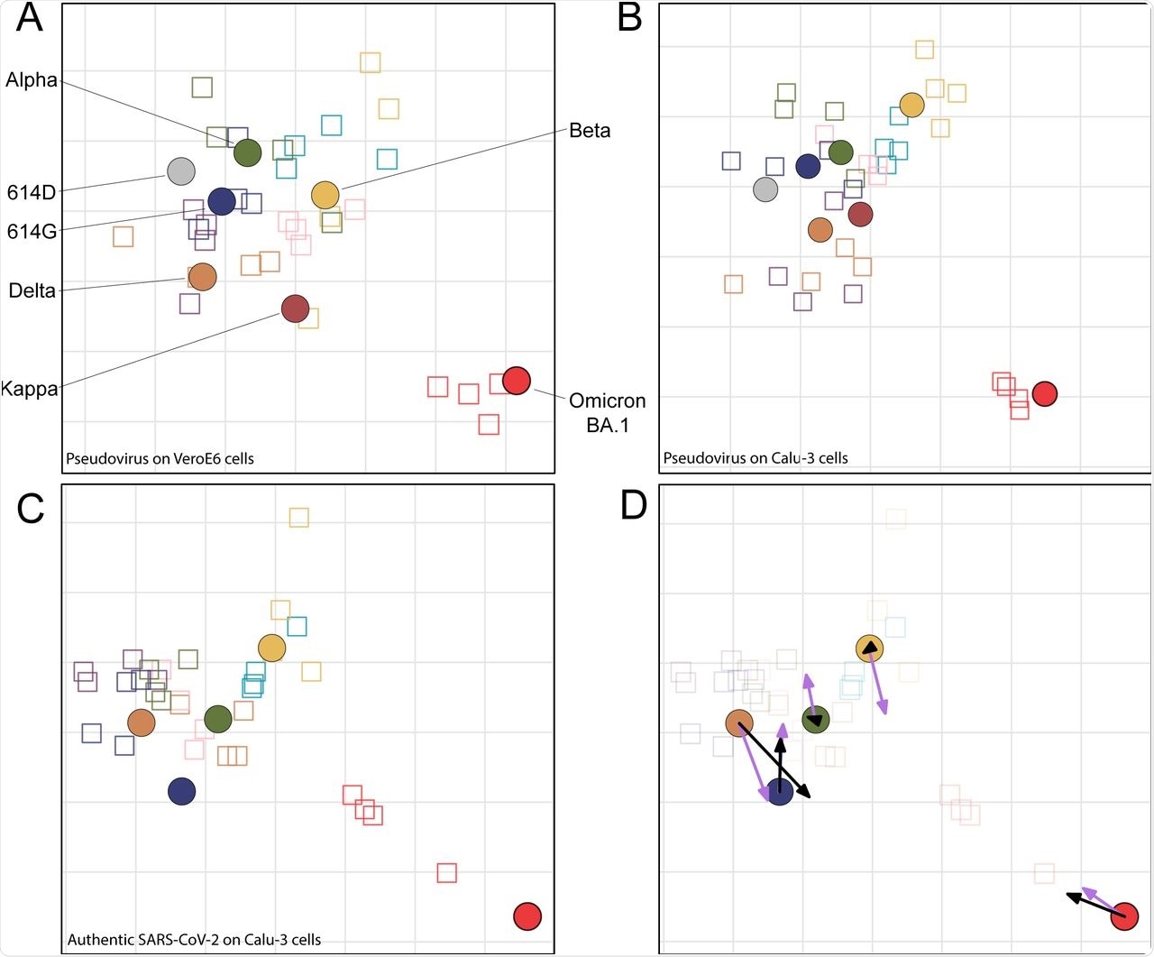 Antigenic maps Comparing neutralizations with SARS-CoV-2 pseudoviruses and authentic SARS-CoV-2.