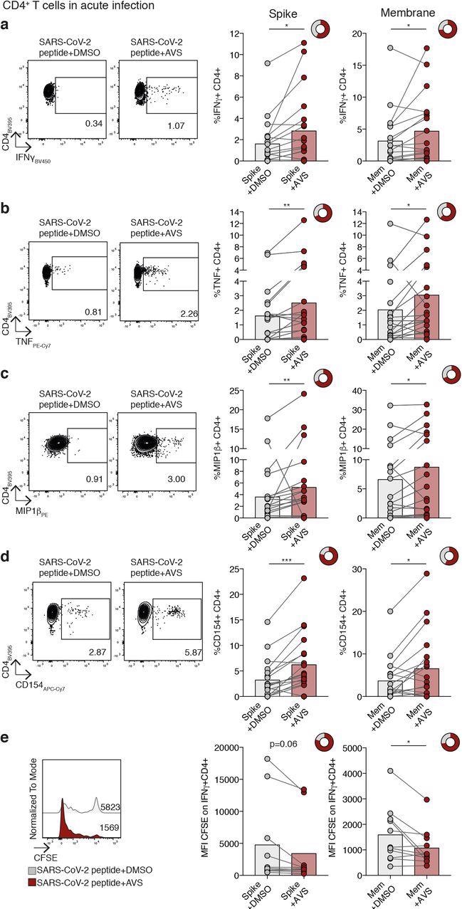 While CD8+ T-cells were also similarly enhanced in response to AVS in individual donors, the overall change across the cohort was insignificant. Treatment with AVS also increased the proliferation of SARS-CoV-2-specific CD4+ T-cells.