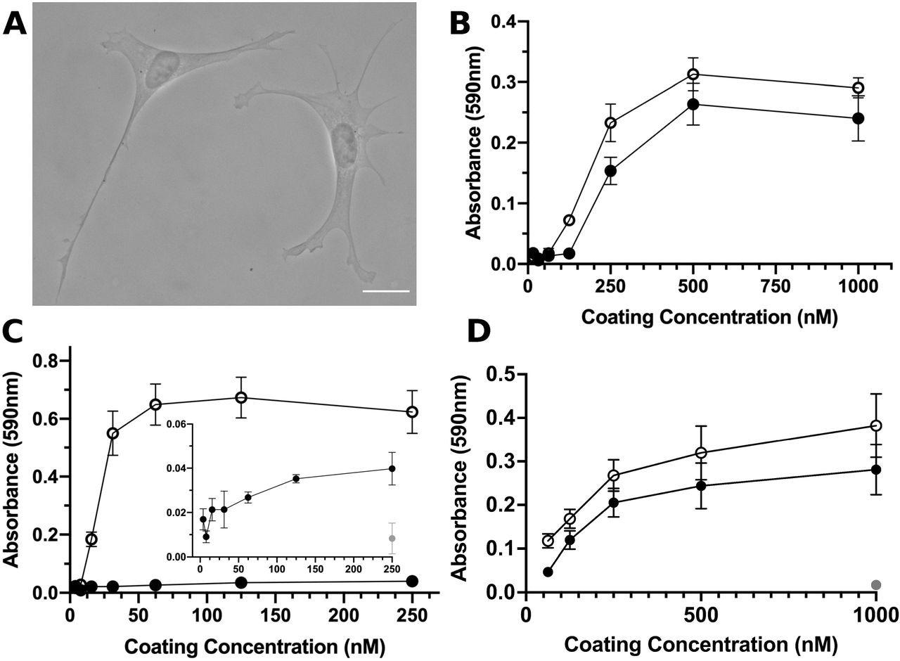 S1-RBD supports cell adhesion and proliferation. A, FN-null MEFs (2.5×10 cells/cm) were seeded onto coverslips pre-coated with S1-RBD (500 nM) and cultured for 4 h prior to fixation and phase-contrast imaging. Scale bar, 20 μm. B, FN-null MEFs (1.9×105cells/cm2) were seeded onto tissue culture plates precoated with the indicated concentration of S1-RBD (filled circles) or FNIII10 (open circles). Cells were cultured for 90 min and relative cell number was determined by crystal violet staining. C, FN-null MEFs (1.9×105 cells/cm2) were seeded onto plates pre-coated with HN-tagged S1 (filled circles) or FNIII8-13 (open circles) for 90 min. Inset shows cell adhesion to S1 (filled circles) compared to BSA-coated wells (gray circle). D, FN-null MEFs (2.3×103 cells/cm2) were seeded onto tissue culture plates pre-coated with the indicated concentration of S1-RBD (filled circles), FNIII10 (open circles), or GST (gray circle) and cultured for 4 d. Relative cell number was determined by crystal violet staining. Data are mean ± SEM; n ≥ 3 experiments performed in triplicate.