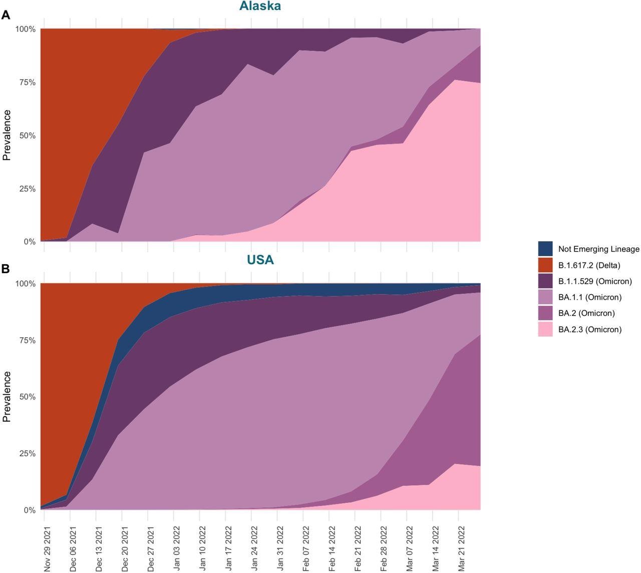 The Omicron sublineage BA.1.1 prevailed in both Alaska (66.3%) and the Lower (67.2%). During this time, the Omicron sublineage BA.2 was detected in some parts of the U.S.