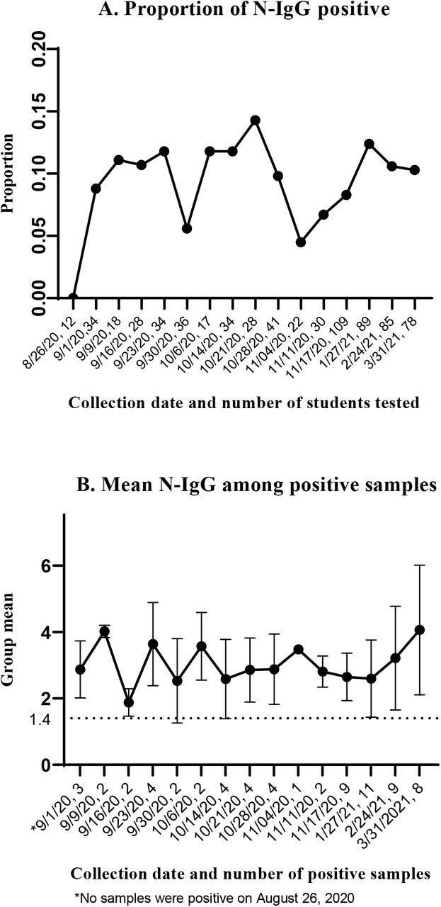 Descriptive Statistics of nucleocapsid (N) IgG among young adults by collection date