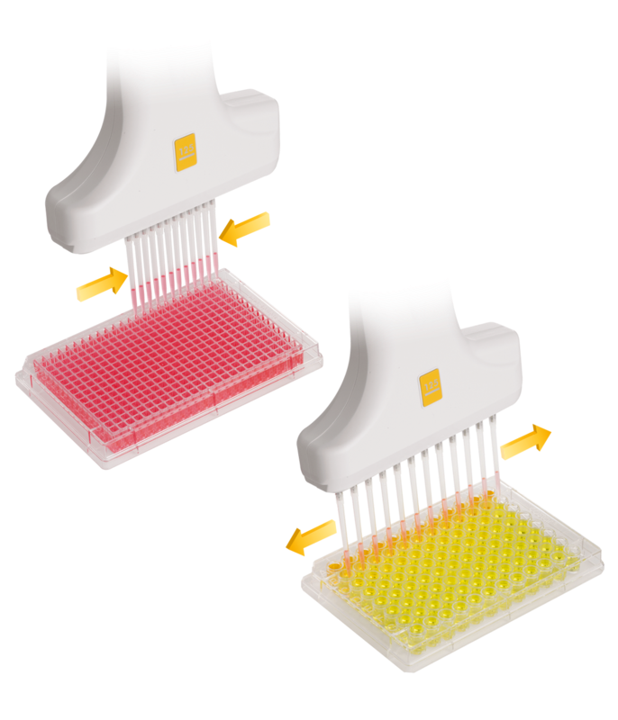 Therefore, we needed a robust and reproducible method of transferring the venoms from 96 to 384 well plates formats. Our team uses a VOYAGER adjustable tip spacing pipette from INTEGRA Biosciences to increase the efficiency of plate preparation for screening assays. This electronic handheld pipette enables the user to adjust the spacing between each tip to easily transfer samples from one labware format to another.
