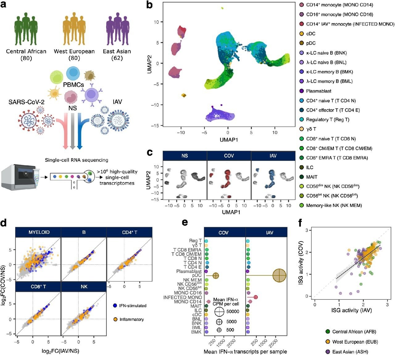 Population-scale single-cell responses to SARS-CoV-2 and IAV. a, Study design. b and c, Uniform manifold approximation and projection (UMAP) of 1,047,824 peripheral blood mononuclear cells: resting (non-stimulated; NS), stimulated with SARS-CoV-2 (COV), or influenza A virus (IAV) for six hours. b, The colors indicate the 22 different cell types inferred. c, Distribution of cells in NS, COV and IAV conditions on UMAP coordinates. Contour plot indicates the overall density of cells, and colored areas delineate regions of high cell density in each condition (gray: NS, red: COV, blue: IAV). d, Comparison of transcriptional responses to SARS-CoV-2 and IAV across major immune lineages. Hallmark inflammatory and interferon-stimulated genes are highlighted in orange and blue, respectively. e, Relative expression of IFN-α-encoding transcripts by each immune cell type in response to SARS-CoV-2 and IAV. Bar lengths indicate the mean number of IFN-α transcripts contributed by each cell type to the overall pool (cell type frequency × mean number of IFN-α transcripts per cell). Dot area is proportional to the mean level of IFN-α transcripts in each cell type (counts per million). f, Correlation of ISG activity scores between individuals, following exposure to SARS-CoV-2 and IAV. Each dot corresponds to a single individual (n = 222) and its color indicates the self-reported ancestry of the individual concerned (AFB: Central African; EUB: West European; ASH: East Asian).