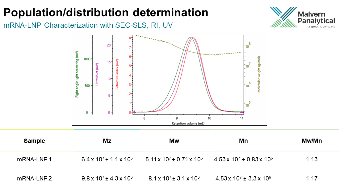 These averages help us to quantify the distribution with the whole sample population. The presence of small material is given by the Mn and the presence of large molecular weights from our Mz. The Mn results of the two formulations are similar but the Mw and Mz show us that the mRNA-LNP 2 formulation contains much more bigger material.