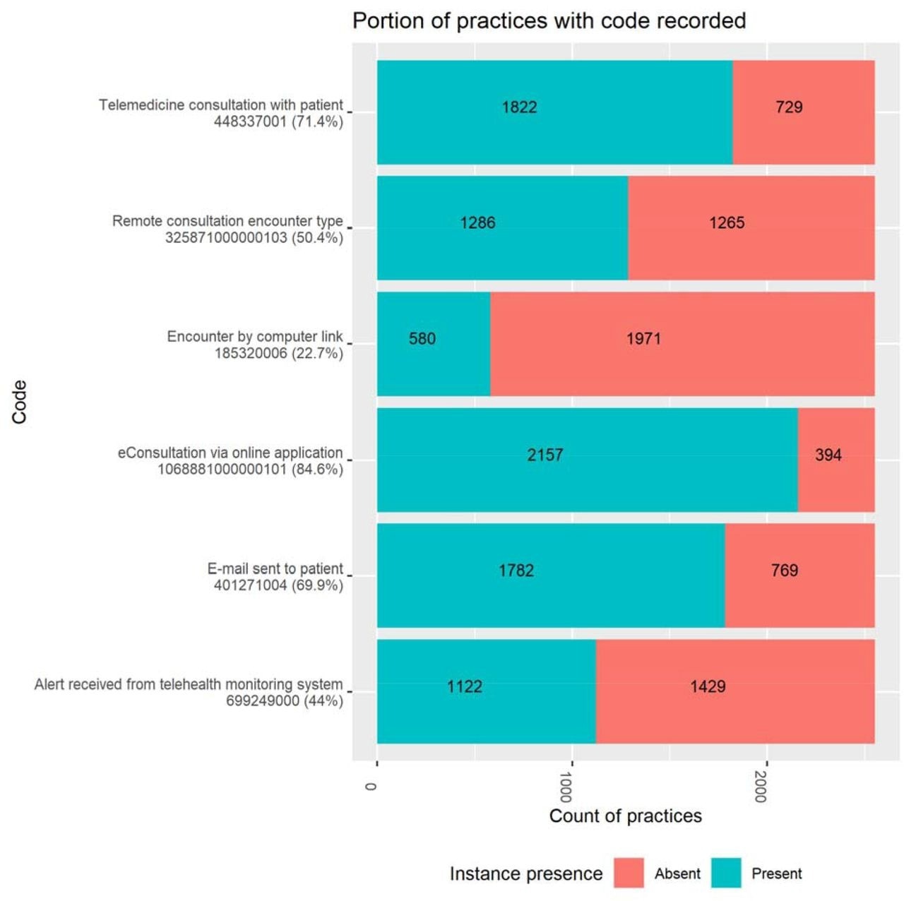 Portion of TPP practices with any recorded activity for online consultation relevant codes in general practice (January 2019 - December 2020). Codes with no activity at all omitted.