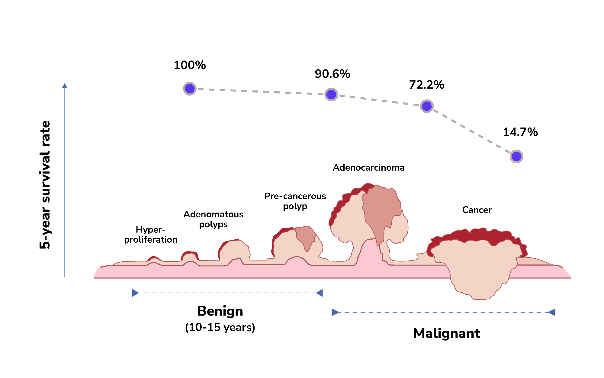 A cohort study indicates that removing adenomatous polyps of the colon and rectum can reduce the incidence of colorectal cancer cases by 76-90%.4 Statistics from the SEER Program of the National Cancer Institute also show that the five-year survival rate of early-stage colorectal cancer (stage I-II) can be as high as 90.6%.5 In contrast, the five-year survival rate drops significantly to 14.7% when diagnosed at stage IV.5
