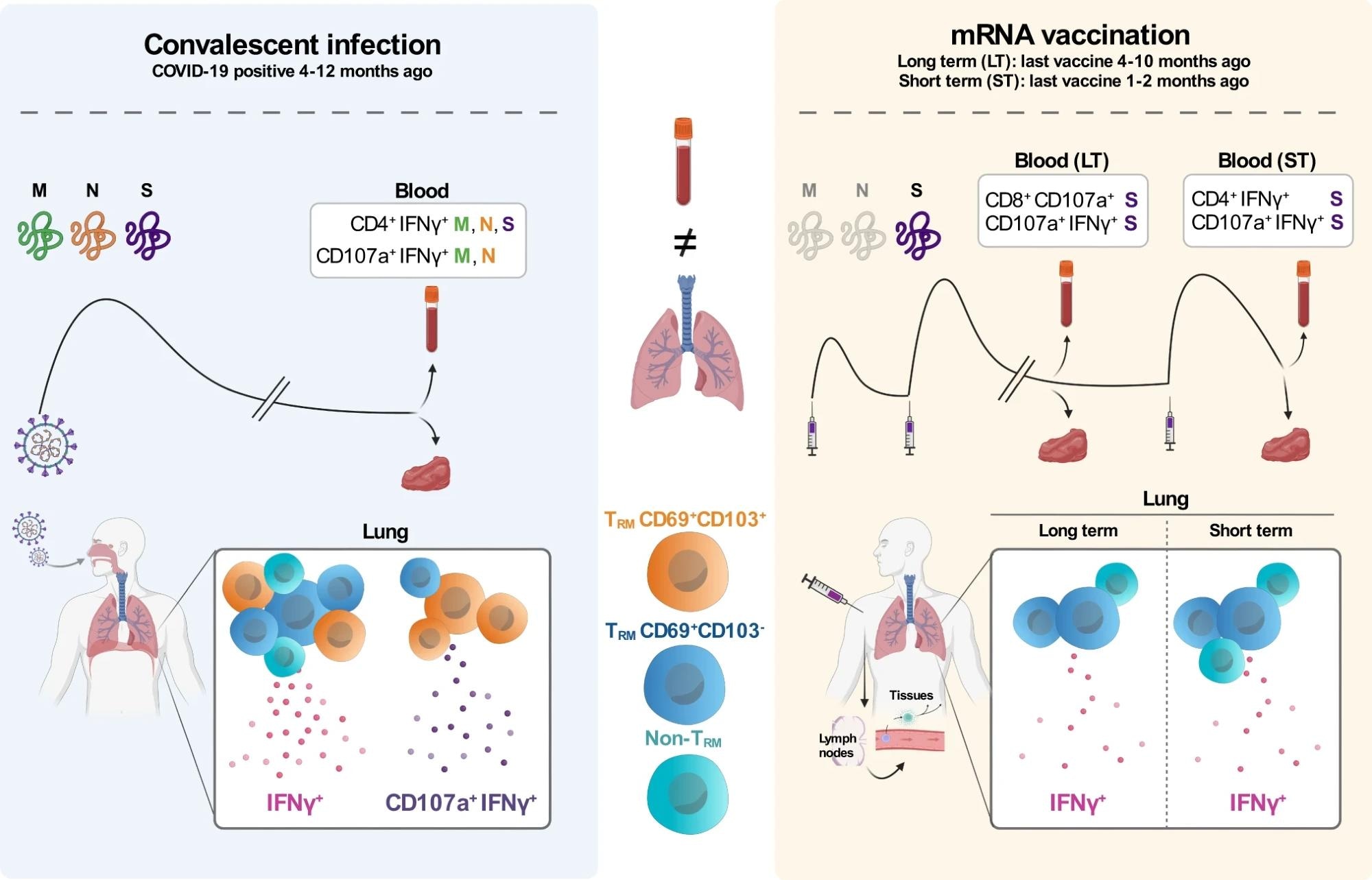The focus of the study was to identify T cell responses against SARS-CoV-2 in paired blood and lung tissue samples of patients that recovered from COVID-19 between 4 to 12 months ago (convalescent infection, left panel) and patients that were uninfected and mRNA vaccinated either between 4 to 10 months ago (LT long term, right panel) or between 1 and 2 months ago (ST short term, right panel). Left: Infection with SARS-CoV-2 triggers the immune system to respond against multiple viral proteins, including the M, N, and S proteins. In the blood of convalescent patients, CD4+ T cells responded to M, N, and S peptides by producing IFNγ and both CD4+ and CD8+ T cells responding to M and N peptides by producing IFNγ and CD107a. Moreover, in the lung of these patients, we found T cells with mainly TRM (CD69+CD103+ and CD69+CD103-) phenotypes producing IFNγ or a combination of IFNγ and CD107a. Right: mRNA-vaccinated patients are only exposed to mRNA encoding for the SARS-CoV-2 S protein. In the blood of LT vaccinated patients, CD8+ T cells responded to S peptides by producing CD107a and CD4+ and CD8+ producing IFNγ and CD107a. In the blood of ST-vaccinated patients, the response to S peptides mainly consisted of CD4+ T cells producing IFNγ and CD4+ and CD8+ producing IFNγ and CD107a. In contrast to T cell responses in the lung of convalescent-infected patients, both LT and ST mRNA-vaccinated patients showed a less prominent IFNγ response mainly produced by CD69+CD103- TRM cells and non-TRM cells. Last, CD69+CD103+ TRM producing IFNγ and CD107a were virtually absent in the lungs of these vaccinated patients.