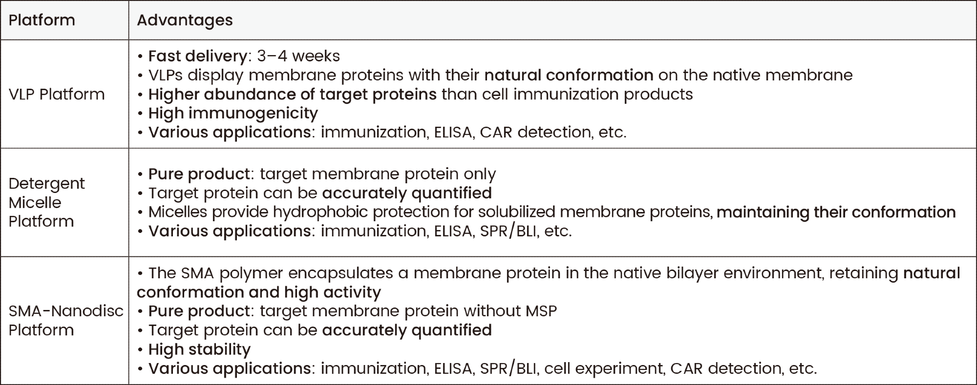Table 1. Advantages of VLP, detergent micelle, and SMA-nanodisc platforms. Sino Biological