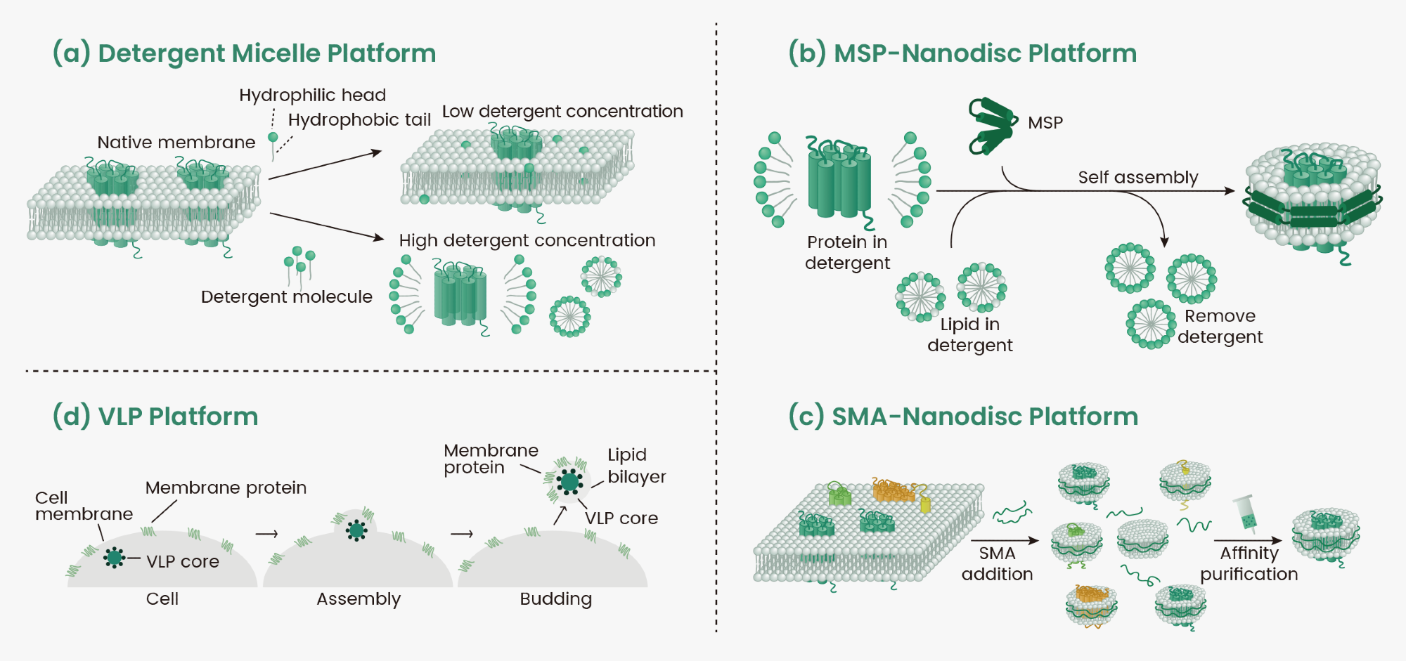 Figure 1. Schematic diagram of detergent, nanodisc, and VLP platforms. Image Credit: Sino Biological Inc.