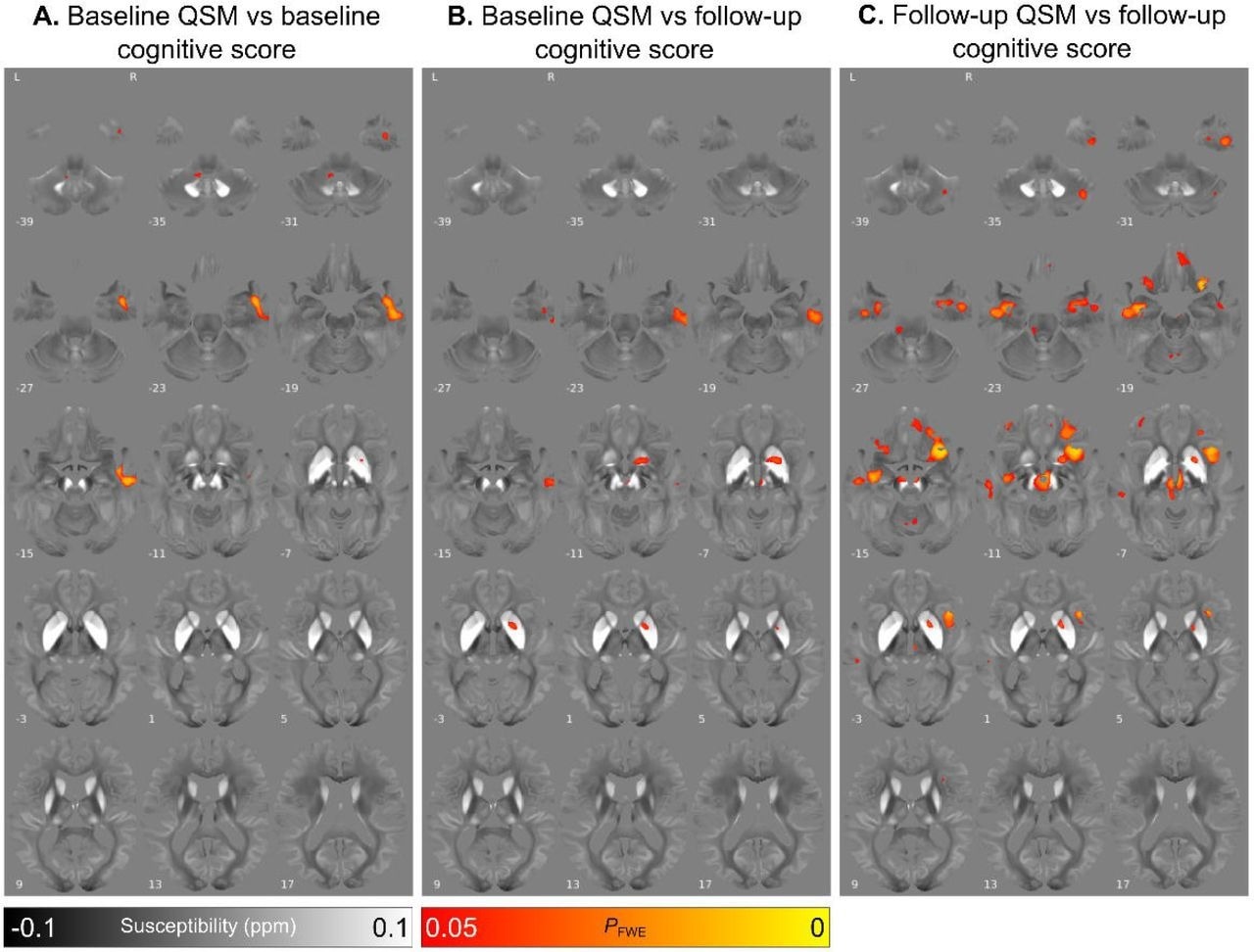 Relationship between increased absolute magnetic susceptibility and declining cognitive ability over the Parkinson’s disease course, in a whole brain analysis. A. Association between baseline susceptibility and composite cognitive score at baseline, adjusted for age at baseline and sex. B. Association between baseline susceptibility and composite cognitive score at 3-year follow-up, adjusted for age at baseline, sex and time between scans. C. Association between susceptibility at 36-month follow-up and composite cognitive score at 3-year follow-up, adjusted for age at follow-up and sex. Results are overlaid on the study-wise QSM template in MNI space, and numbers represent axial slice location in MNI space. Left side is shown on the left. Red/yellow clusters represent voxels where a significant relationship was seen at FWE-corrected P<0.05.