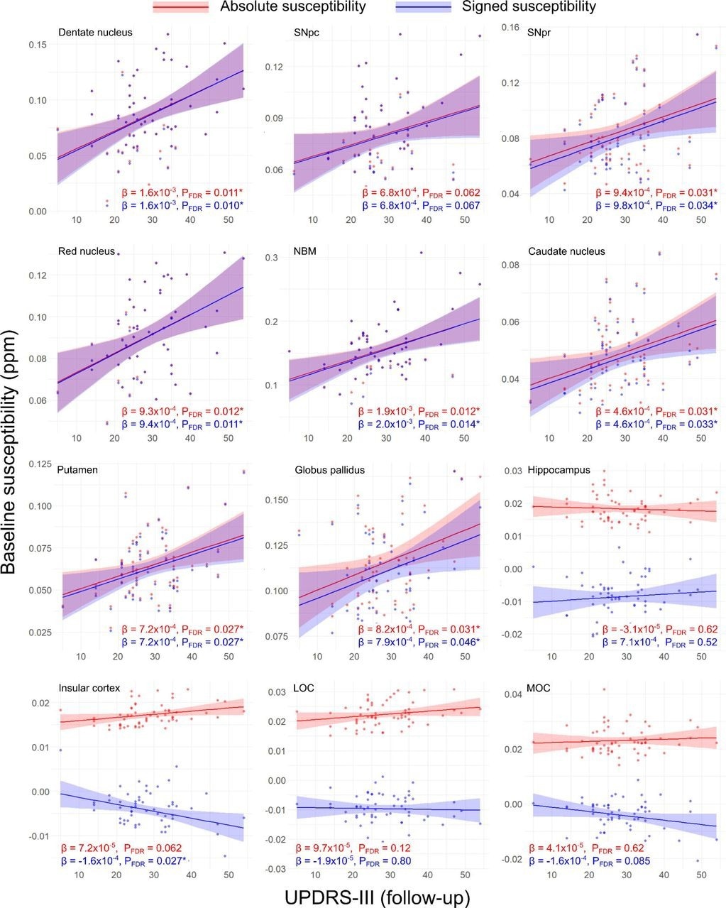 Regional relationships between baseline magnetic susceptibility and follow-up motor severity score in PD. Data and statistics relating to absolute magnetic susceptibility are shown in red, and those relating to signed susceptibility are shown in blue. Results are adjusted for age at baseline, sex and time between scans. FDR-corrected p-values (PFDR) are presented, with asterisks indicating significant interactions at PFDR < 0.05. β is the linear model coefficient associated with MDS-UPDRS-III score. SNpc/pr = substantia nigra pars compacta / pars reticulata; NBM = nucleus basalis of Meynert; MOC = medial orbitofrontal cortex; LOC = lateral orbitofrontal cortex; MDS-UPDRS-III = Movement Disorders Society Unified Parkinson’s Disease Rating Scale part III.