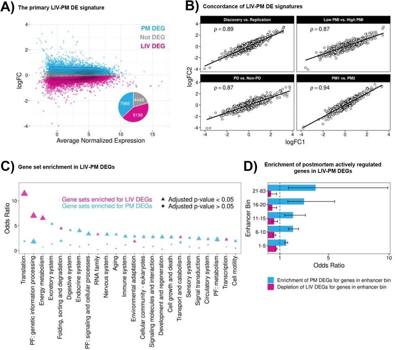 (A) LIV-PM DE results in the full LBP cohort. The scatterplot has one point for each of the 21,635 genes expressed in the full LBP cohort (275 LIV samples and 243 PM samples). The x-axis of the scatterplot is the average normalized expression level for each gene. The y-axis of the scatterplot is the LIV-PM DE regression model beta (by convention, the “logFC”) for each gene. Blue points represent DEGs upregulated in PM samples relative to LIV samples and pink points represent DEGs upregulated in LIV samples relative to PM samples. Grey points represent genes that were not differentially expressed between LIV samples and PM samples. The pie chart shows the fraction of scatterplot points that are blue, pink, and grey. The numbers in the pie chart indicate the number of LIV DEGs, PM DEGs, and Not DEGs. (B) LIV-PM DE Signature Comparisons. Each of the four scatterplots depict the relationship between LIV-PM DE signatures generated from independent subsets of LBP samples. X- and y-axes are the logFC values of the two LIV-PM DE signatures being compared in the plot. The Spearman’s correlation coefficient (ρ) between the two LIV-PM DE signatures is shown. The LIV-PM DE signatures compared in each plot are indicated by the plot title and fully described in the main text. For the “Low PMI vs High PMI” panel, only PM1 is depicted. (C) Gene set enrichment in LIV-PM DEGs. Each circle or triangle is a KEGG gene set tested for enrichment in LIV DEGs (pink circles and triangles) and PM DEGs (blue circles and triangles). The x-axis is the parent category of the gene set in the KEGG database. The y-axis is the Fisher’s Exact Test odds ratio for enrichment of a KEGG gene set in LIV DEGs and PM DEGs. Only parent categories with >=1 significant enrichment in either LIV DEGs or PM DEGs are included in the figure. For a given parent category, the KEGG gene set with the smallest p-value in LIV DEGs and PM DEGs is plotted. Triangles indicate that the enrichment test result is significant after p-value adjustment and circles indicate that the enrichment test result is not significant. The size of the triangles and circles corresponds to the -log10(p-value) of the Fisher’s Exact Test, meaning larger sizes are more statistically significant. The full KEGG gene set enrichment results for LIV DEGs and PM DEGs are provided in Supplementary Table 2 with a column indicating the gene sets depicted in this figure. (D) Enrichment of postmortem actively regulated genes in LIV-PM DEGs. Each of the 3,852 actively regulated genes expressed in the full LBP cohort was assigned to one of five sequential “enhancer bins” based on the number of high-confidence active enhancers linked to the gene (i.e., 1-5, 6-10, 11-15, 16-20, or 21-83). The x-axis is the Fisher’s Exact Test odds ratio for the overlap of enhancer bin genes with LIV DEGs (pink bars) or PM DEGs (blue bars). The y-axis indicated the enhancer bin.