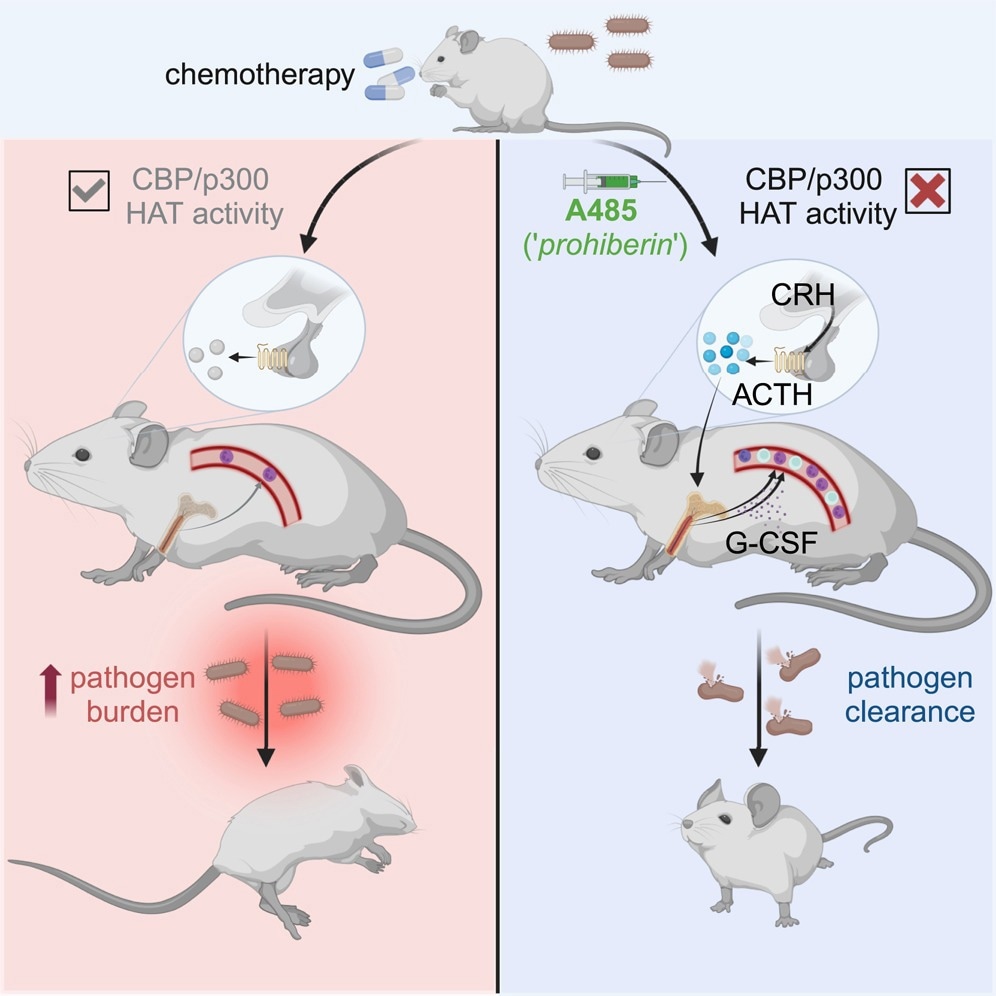 "Competitive, reversible, small-molecule-mediated inhibition of the CBP/p300 HAT domain triggers acute and transient leukocyte mobilization from the bone marrow." Further research is required to identify which clinical contexts are ideal for this drug. A485 may be better if only a rapid short increase in neutrophils is required, while long-term recovery of blood cell production in the bone marrow may call for G-CSF.