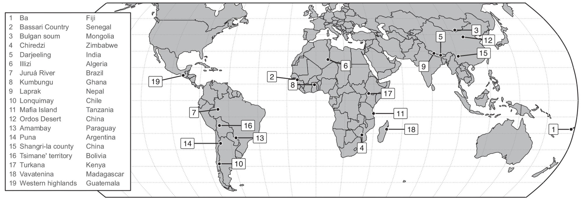 The study focused on small-scale and non-industrialized societies to elicit local perspectives on climate change; a question was also included to assess life evaluation. The communities included in the study were all strongly reliant on nature but were distinct in terms of culture, society, and environment.