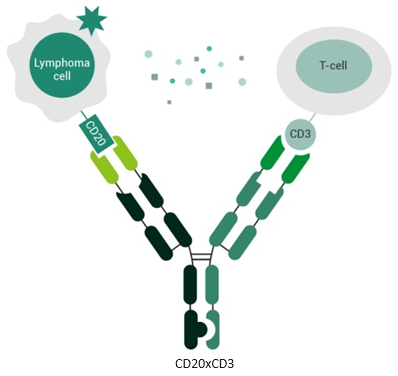 • CD20 × CD3: Bridging T cells to CD20+ B-cell lymphomas