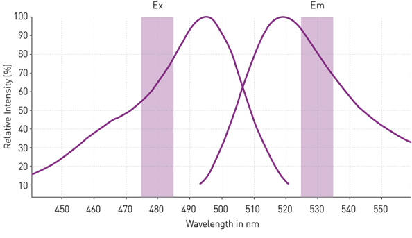 To improve the limit of detection, it is crucial to select wavelengths close to these maxima. For example, in the case of the fluorophore in the graph below, we set the excitation and emission wavelengths to 480 and 530 nanometers, respectively.
