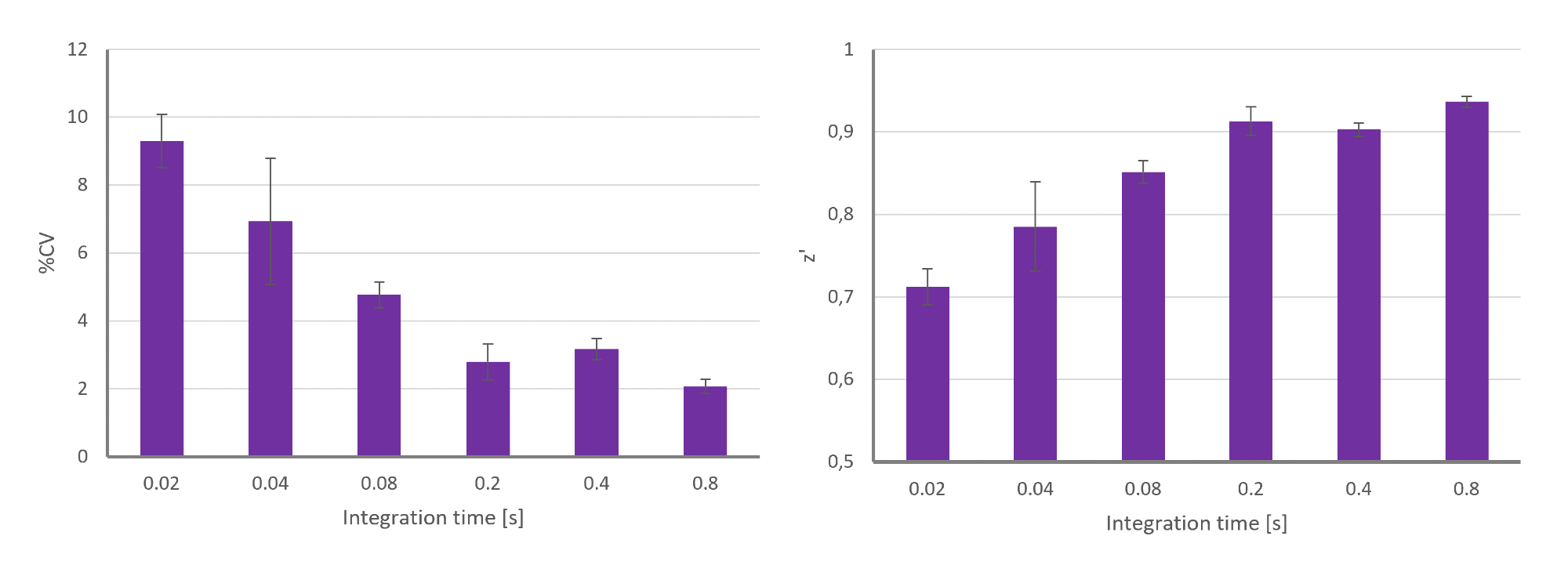 Data variability (%CV= coefficient of variance) and data quality (Z’) plotted for different integration times applied in a glow luminescence-based assay. Image Credit