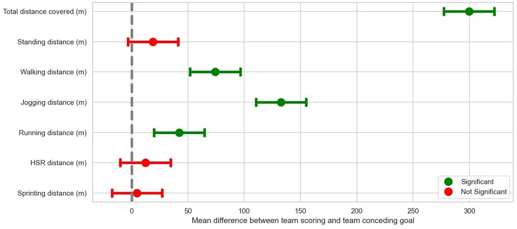 Specifically, goal-scoring teams exhibited significantly higher total distance covered, walking distance, jogging distance, and running distance compared to goal-conceding teams. The differences in other tested parameters were not statistically significant between the teams.
