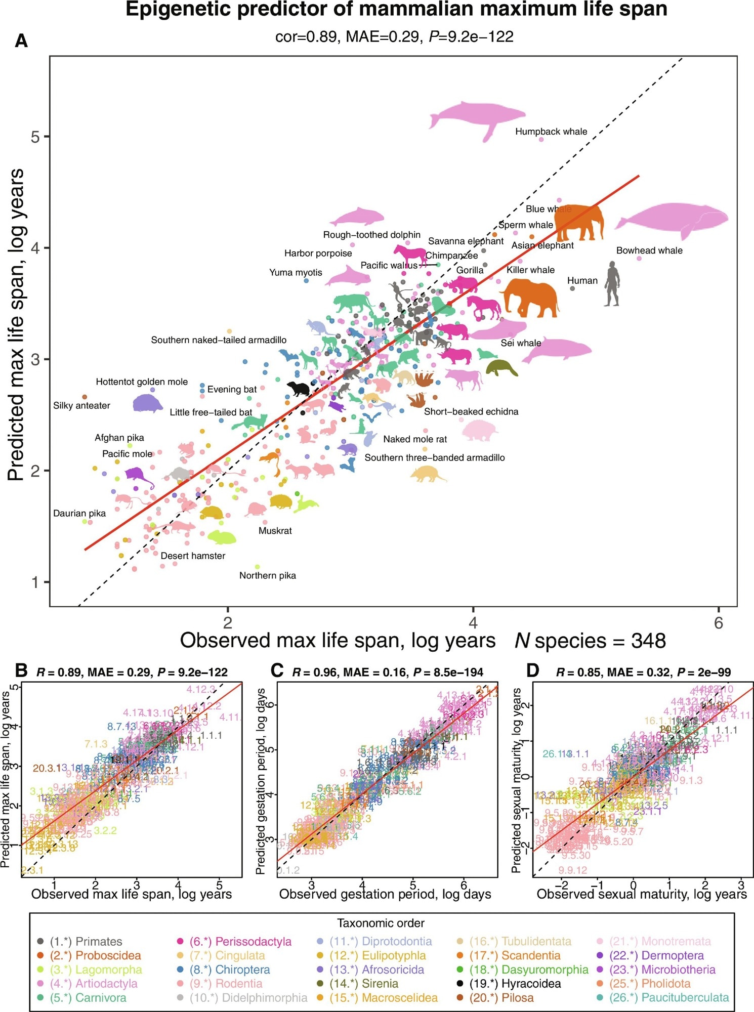 Multivariate analysis of life-history traits using epigenetic predictors. This figure summarizes the leave-one-species-out (LOSO) cross-validation analysis of epigenetic predictors. All estimates are log-transformed (base e) for various life-history traits, including (A and B) maximum life span (in log years), (C) gestation time (in log days), and (D) age at sexual maturity (in log years). Each species in the scatterplot panels is symbolized by a specific number. The whole number (integer) part of this numeric representation corresponds to its taxonomic order. These numbers, color-coded by their respective taxonomic orders, link to distinct species. For detailed numeric values, refer to table S4 and fig. S8. The title atop each panel provides Pearson correlation coefficient (R), median absolute error (MAE), and a two-sided unadjusted P value (P). Consistency in color representation for taxonomic orders is maintained throughout this and other related figures. A dotted line within the scatterplots represents the line of perfect prediction, while the solid red line is the fitted linear regression. Animal silhouettes featured are sourced from the Phylopic database (https://www.phylopic.org/) or Wikimedia, which are under public domains or the CC BY 3.0 license