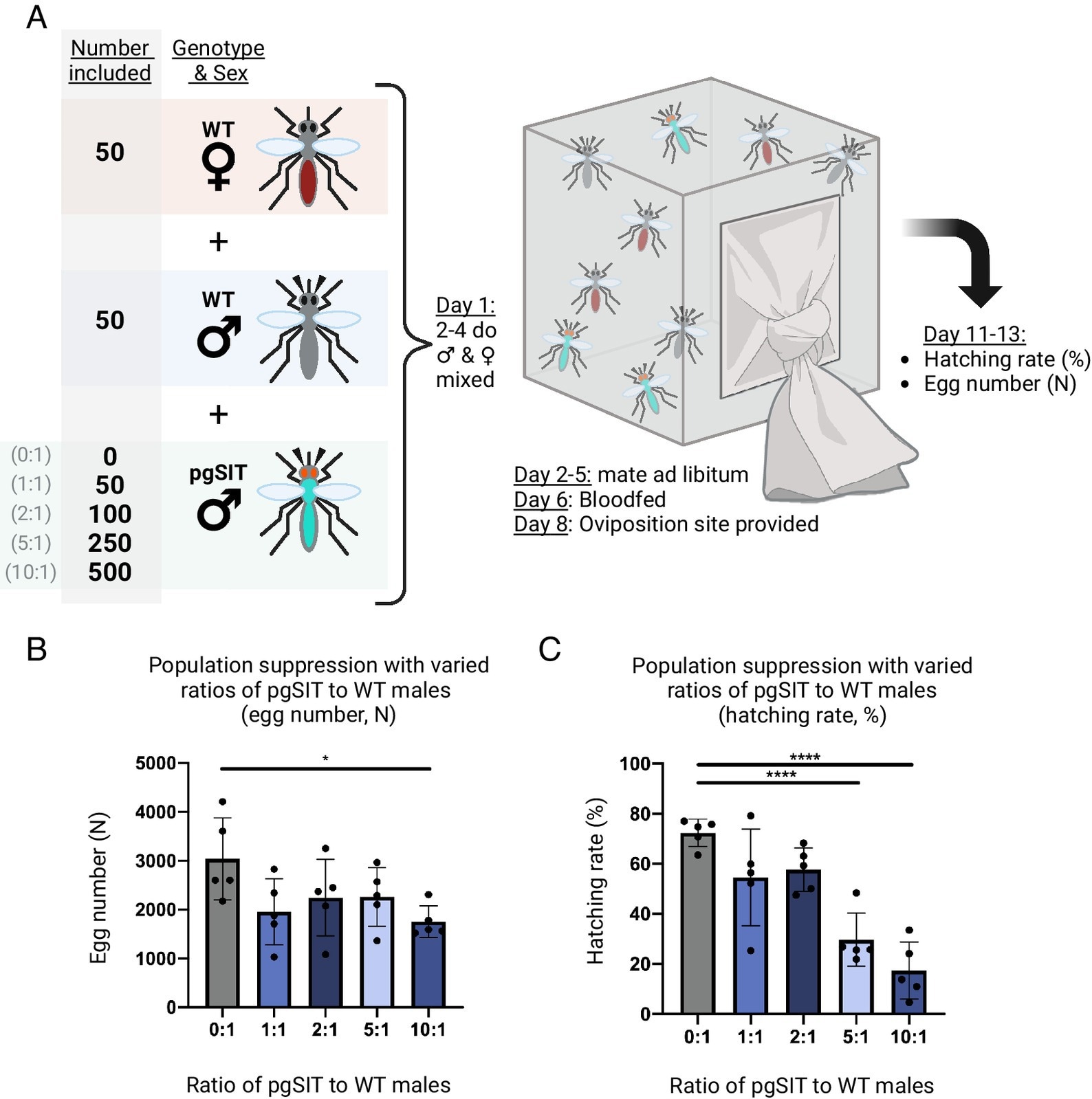 Population suppression following release of pgSIT males at different ratios to wild type. (A) Test suppression cages were established with 50 wild type males, 50 wild type virgin females, and either 0, 50,100, 250, or 500 pgSITD15 males (for the 0:1, 1:1, 2:1, 5:1, and 10:1 pgSIT:wild type male ratios respectively). After mating and blood feeding, the hatching rate was calculated for each cage. (B) The egg counts from population suppression assay cages. Groups 0:1 and 10:1 are significantly different (P < 0.05, Dunnett’s multiple comparisons). Mean and SD shown. (C) Population suppression as measured by the hatching rate (%) from cages suppressed by different ratios of pgSIT males to wild type males. Hatching rate is reported as the percent of eggs which hatched (n% = n 1-d-old larvae/n eggs laid). The 0:1 control group differs significantly with both the 5:1 (P < 0.001) and 10:1 (P < 0.001) groups (one-way ANOVA, Dunnett’s multiple comparisons test). Mean and SD shown. Created with Biorender.com.Population suppression following the release of pgSIT males at different ratios to wild type. (A) Test suppression cages were established with 50 wild-type males, 50 wild-type virgin females, and either 0, 50,100, 250, or 500 pgSITD15 males (for the 0:1, 1:1, 2:1, 5:1, and 10:1 pgSIT:wild-type male ratios respectively). After mating and blood feeding, the hatching rate was calculated for each cage. (B) The egg counts from population suppression assay cages. Groups 0:1 and 10:1 are significantly different (P < 0.05, Dunnett’s multiple comparisons). Mean and SD shown. (C) Population suppression as measured by the hatching rate (%) from cages suppressed by different ratios of pgSIT males to wild type males. The hatching rate is reported as the percent of eggs that hatched (n% = n 1-d-old larvae/n eggs laid). The 0:1 control group differs significantly with both the 5:1 (P < 0.001) and 10:1 (P < 0.001) groups (one-way ANOVA, Dunnett’s multiple comparisons test). Mean and SD shown. Created with Biorender.com.