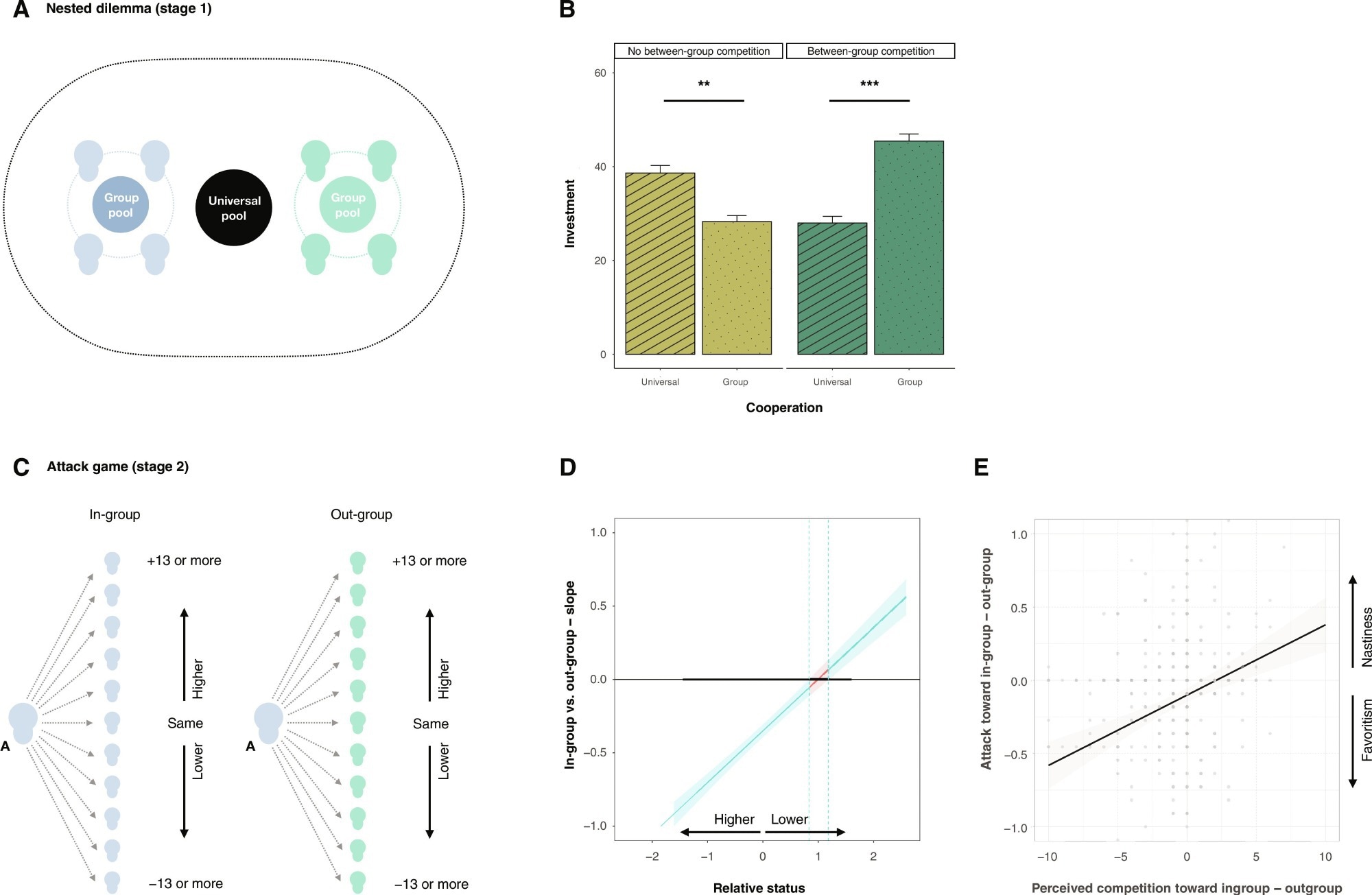 In-group cooperators and nasty neighbors in minimal groups. (A and C) Experimental setup of the nested social dilemma (top; stage 1, A) with an attack option (bottom; stage 2, C). (B) Between-group competition favors the emergence of in-group favoritism. Bar chart showing in-group favoritism and universal cooperation as mean percentage of the endowment contributed when competition is absent versus present. **P < 0.01, ***P < 0.001. (D) Status differences favor the emergence of within-group nastiness. Floodlight plot showing the regions of differences in status of the target of attack (x axis, standardized) for which the effect of in-group versus out-group (y axis) on attack becomes significant. The vertical lines in the floodlight plot show the exact values at which significance begins and ends. Blue lines indicate significance at 5% level. (E) Relative differences in perceived competition favor the emergence of a nasty neighbor effect. Scatterplot shows the association between perceived competition toward in-group members (minus out-group) and the nasty neighbor effect (i.e., attack of in-group members minus out-group members).