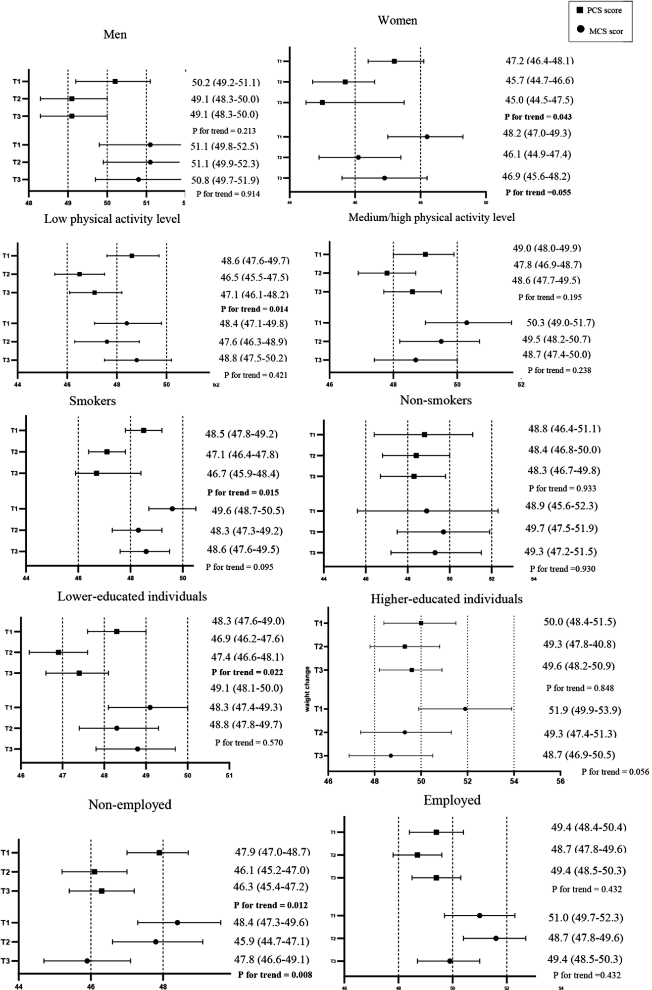Multivariable mean (95% confidence interval) of the association between ultra-processed foods, physical component summary (PCS), and mental component summary (MCS) scores, stratified by sex, lifestyle, and socioeconomic status. Data were adjusted for age, sex, BMI, and energy intake, smoking status, physical activity levels, marital status, education level