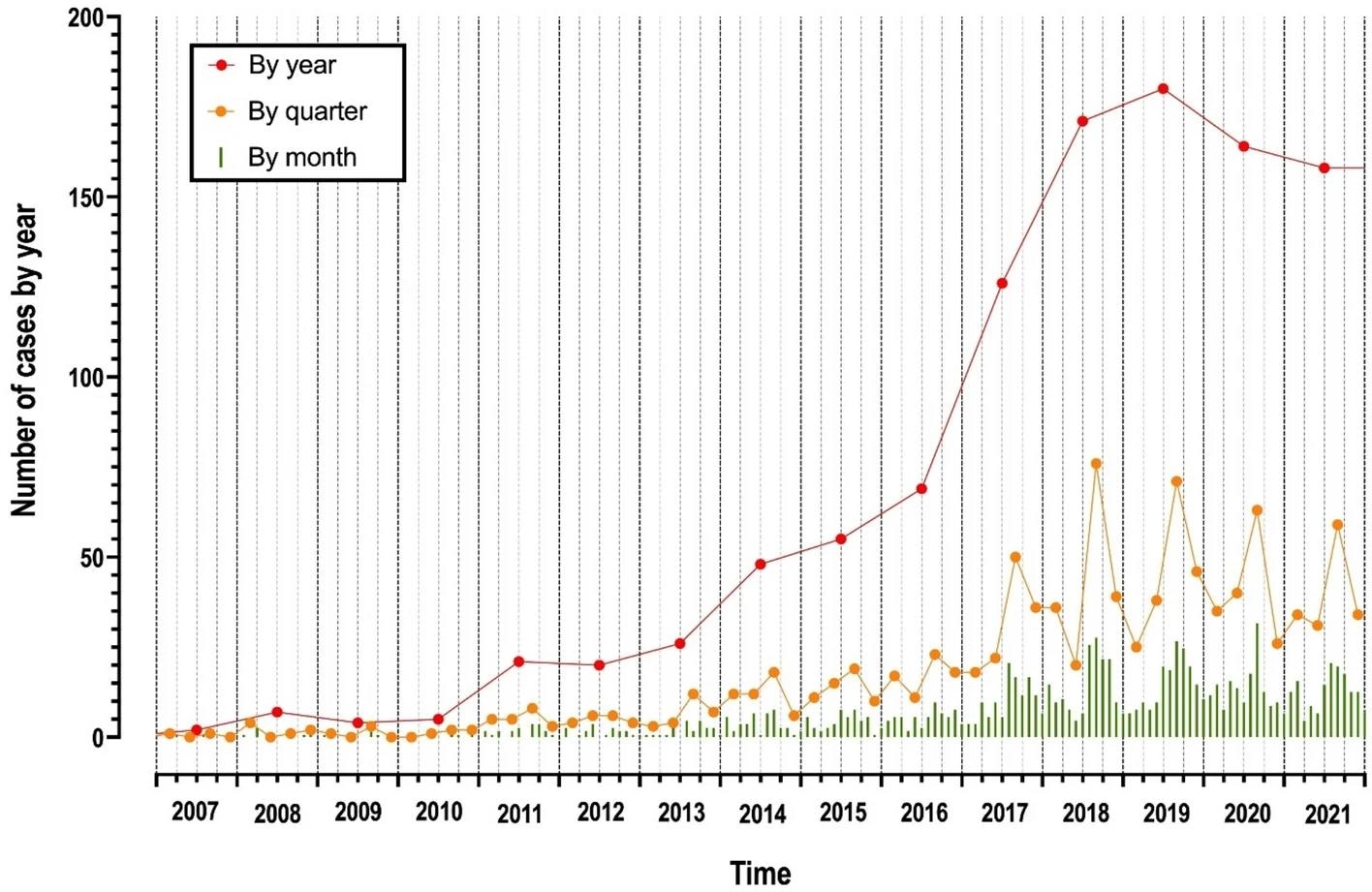 Temporal trends in the number of cases of exposure to insecticides used to treat bed bug infestations reported to French Poison Control Centers (2007–2021): by month (green bars), quarter (orange line), and year (red line).Temporal trends in the number of cases of exposure to insecticides used to treat bed bug infestations reported to French Poison Control Centers (2007–2021): by month (green bars), quarter (orange line), and year (red line).