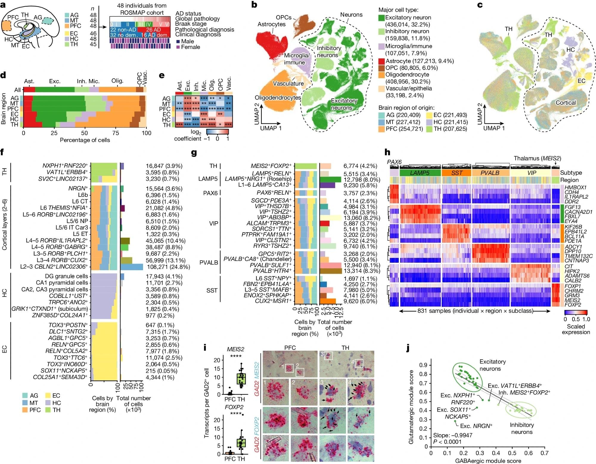 a, snRNA-seq profiling summary, covering 283 samples across 6 brain regions from 48 participants from ROSMAP, showing global pathology, Braak stage and pathological (26 AD and 22 non-AD) or clinical diagnosis of AD (16 AD dementia (dem.) and 32 no dementia). b,c, Joint uniform manifold approximation and projection (UMAP), colored by major cell type (b) and region of origin (c). d, The regional composition of major cell types. e, Relative enrichment of major cell types across regions by quasi-binomial regression. False discovery rate (FDR)-corrected P values are indicated by asterisks; ***P < 0.001, **P < 0.01, *P < 0.05. f,g, Global breakdown, region composition, enrichment and number of nuclei for excitatory (f) and inhibitory (g) neuronal subtypes. h, Gene expression analysis of the top four markers per inhibitory subclass, averaged at the sample by subclass level (columns). i, RNAscope validation of FOXP2 and MEIS2 as markers of the unique thalamus subtype, with quantification (left) performed using Student’s t-tests and representative images (right). The blue puncta represent MEIS2 (top) or FOXP2 (bottom) transcripts and red puncta represent GAD2 transcripts. FOXP2: n = 19 (PFC) and n = 22 (TH) cells; MEIS2: n = 35 (PFC) and n = 26 (TH) cells; each dot represents an individual cell, pooled from eight samples (four individuals; each had one PFC and one thalamus sample). j, Glutamatergic versus GABAergic scores for all neuron subtypes. The dotted lines represent the 95% confidence interval around the linear fit. P values were calculated using two-sided F tests. Ast., astrocytes; exc., excitatory neurons; inh., inhibitory neurons; mic., microglia/immune cells; olig., oligodendrocytes; vasc., vascular/epithelial cells.