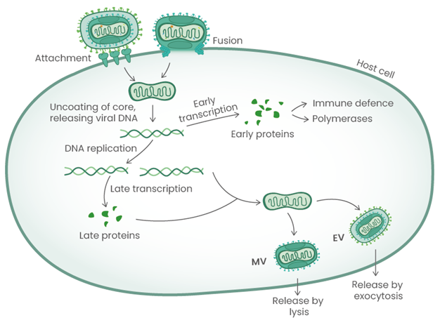 The MPXV life cycle with the different viral antigens playing role at the indicated steps. Image Credit: Sino Biological