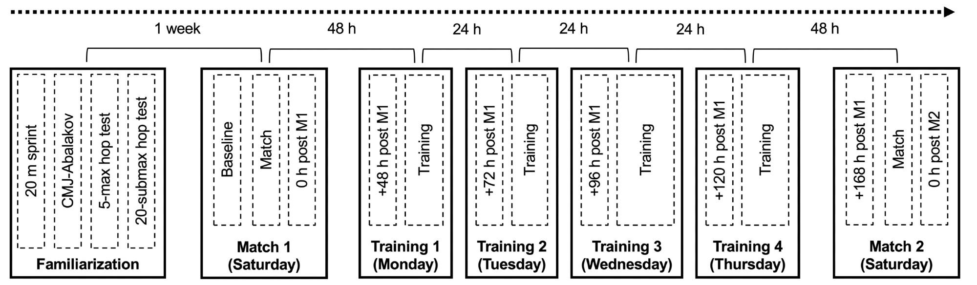 Data collection included health questionnaires, physical tests, and during-match performance assessments using high-accuracy GPS devices with integrated gyroscope, magnetometer, and accelerometer capabilities. Muscle fatigue biomarkers (UR and CK), performance metrics (CMJ height, reactive strength index [RSI], 20 m sprint time, leg stiffness [LS], and landing mechanics), and player-reported perceived well-being were assessed using a randomized circuit-style approach to minimize testing bias.