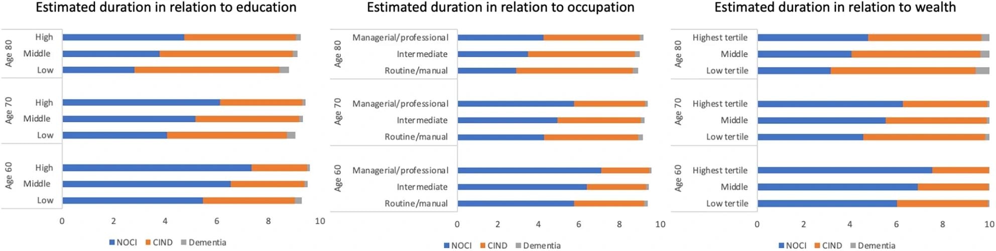 Socioeconomic indicators were not associated with the NOCI-to-dementia transition. People with degree-level education consistently spent more time in the NOCI state at any given age than those with lower education. People who were professionally qualified, wealthy, and well-educated at age 80 had shorter remaining time in dementia or CIND states. Socioeconomically advantaged people had longer sojourn time in the NOCI state and shorter periods in dementia and CIND states.