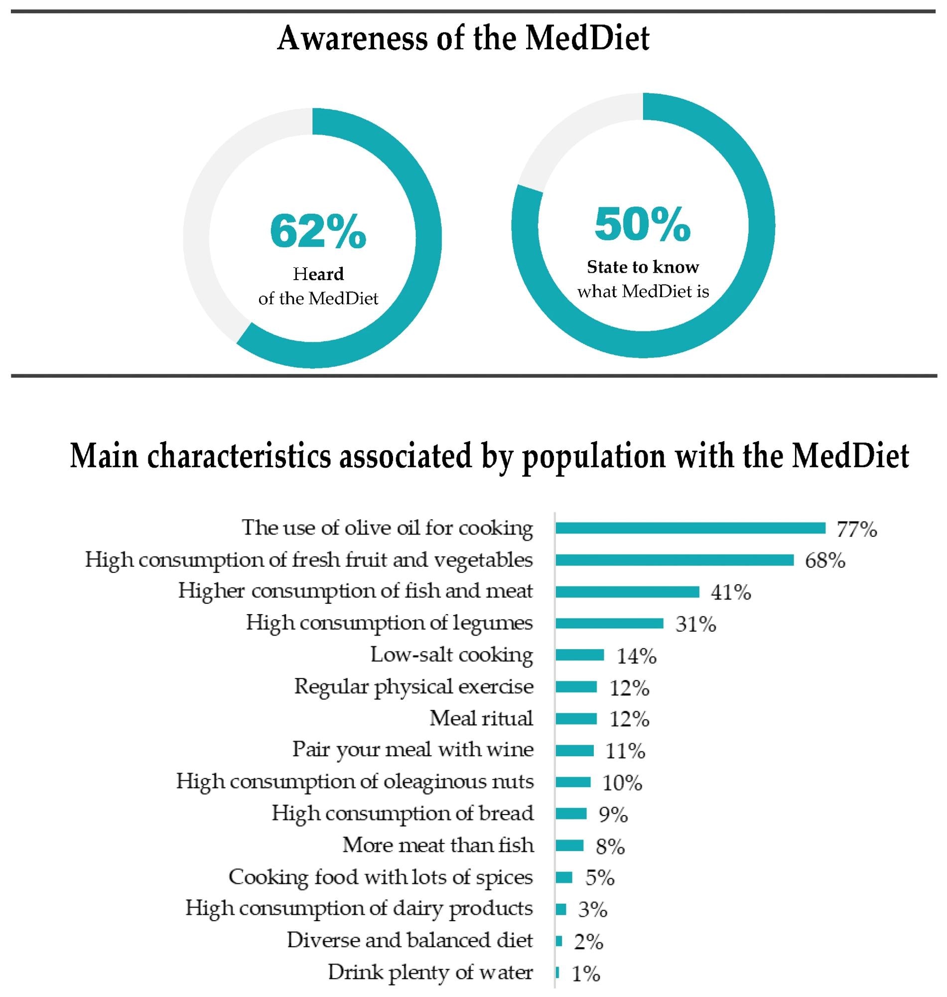 In the study, 1,000 respondents participated, with 62% indicating they had heard of the MedDiet and 80% (about 50% of the total respondents) understanding what it entails. The most commonly recognized features of the MedDiet were the use of olive oil for cooking (77%), high consumption of fresh fruits and vegetables (68%), and a higher intake of fish and meat (41%).