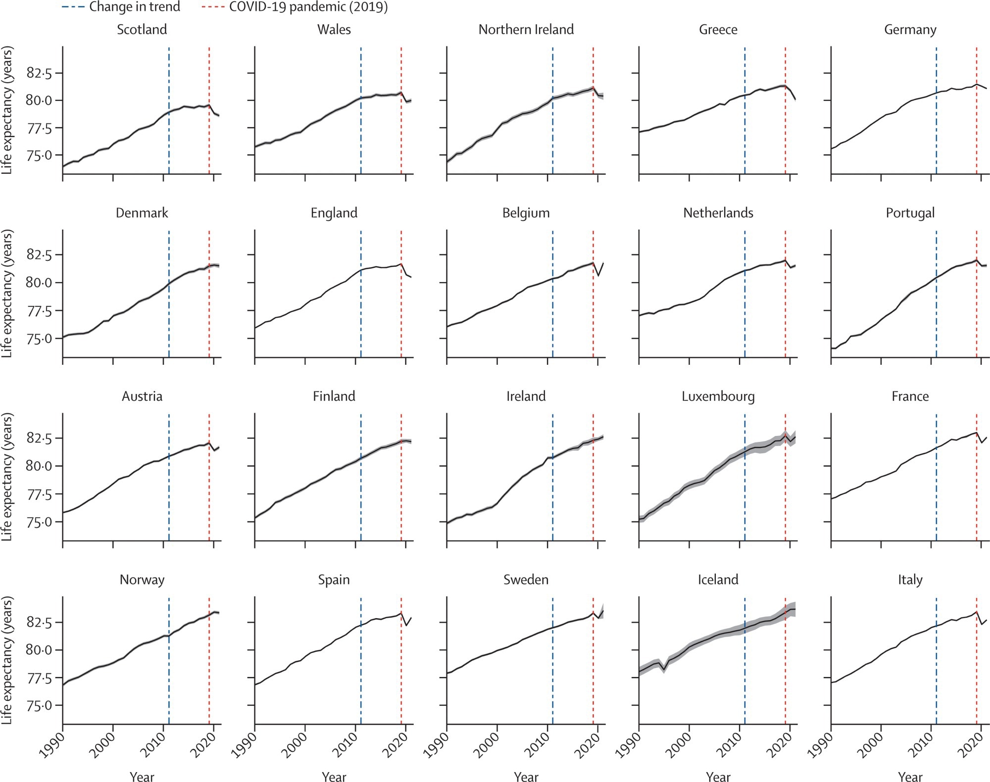 During 2019-21, life expectancy declined in most countries, but some (Ireland, Iceland, Sweden, Norway, and Denmark) saw marginal improvement or no change. The highest reductions in life expectancy were observed in Greece, England, and the other UK nations. The causes of death accounting for the highest life expectancy gains between 1990 and 2011 were neoplasms and cardiovascular diseases (CVDs).