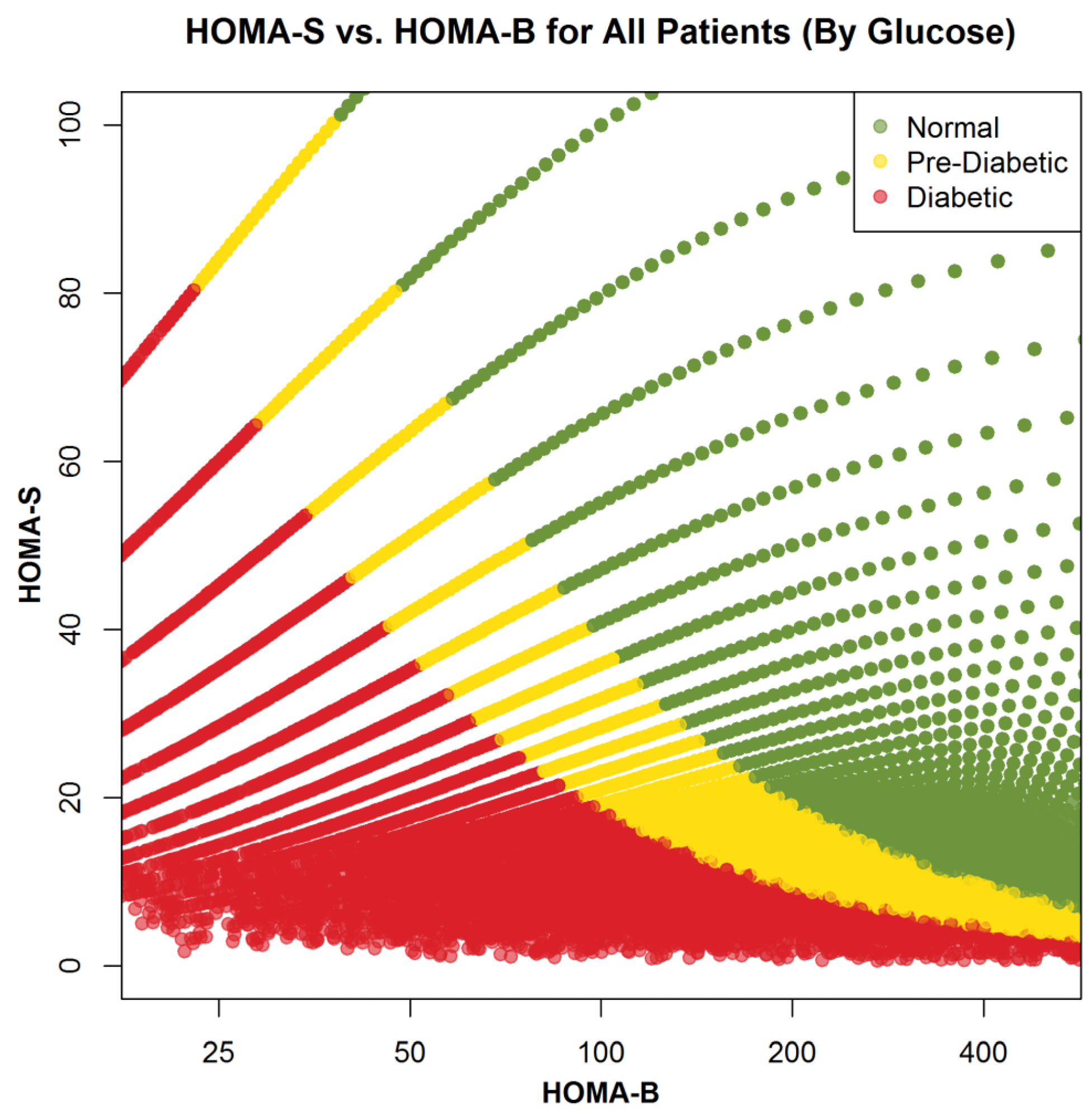 Insulin production and insulin sensitivity in healthy, prediabetic, and diabetic subjects. In this figure, we plotted data for the entire population of 133,764 subjects (56.3% healthy, 36.2% prediabetic, and 7.5% diabetic). Homeostasis assessment model assessment of insulin production, or HOMAβ, was calculated as equal to [360 × fasting insulin (µU/mL)]/[fasting plasma glucose (mg/dL) − 63] as previously described and plotted on the horizontal axis (22). The homeostasis model of insulin resistance, or HOMAIR, was calculated as equal to [fasting insulin (µU/mL)] × [fasting plasma glucose (mg/dL)]/405 as previously described. We then plotted the reciprocal of this value multiplied by 100, or as [(1/HOMAIR) × 100], for the same subjects as a measure of insulin sensitivity (HOMAS). What can be clearly seen on the graph is that diabetic subjects not infrequently have HOMAβ of <60 (the 25th percentile value in healthy subjects), as well as decreased insulin sensitivity as compared to healthy and prediabetic subjects, with clear lines of demarcation between diabetic, prediabetic, and healthy subjects.