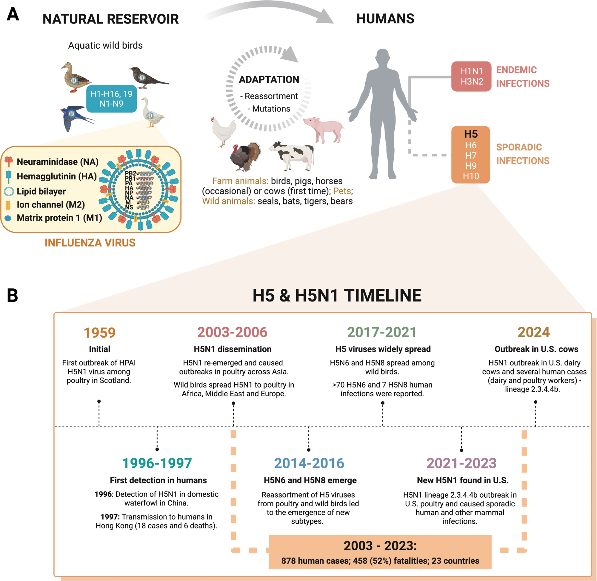 Influenza A virus diversity & host spillover. (A) IAV transmission. IAV jumps from its natural reservoir to different animals, including farmed animals, undergoing adaptation to this new biological environment. The virus can infect humans sporadically or acquire human-to-human transmission traits and become endemic such as the currently circulating subtypes H1N1 and H3N2 that cause yearly epidemics. (B) H5 and H5N1 timeline. HPAI H5N1’s first outbreak was reported in 1959 and first detected in humans in 1997, leading to 6 deaths. Since then, H5N1 and other emergent subtypes (e.g., H5N6 and H5N8) have caused several outbreaks with many human fatalities. Recently, the new H5N1 clade 2.3.4.4b caused an outbreak in U.S. dairy cows, subsequently transmitted to humans (dairy farm workers), threatening human health. Created with Biorender.