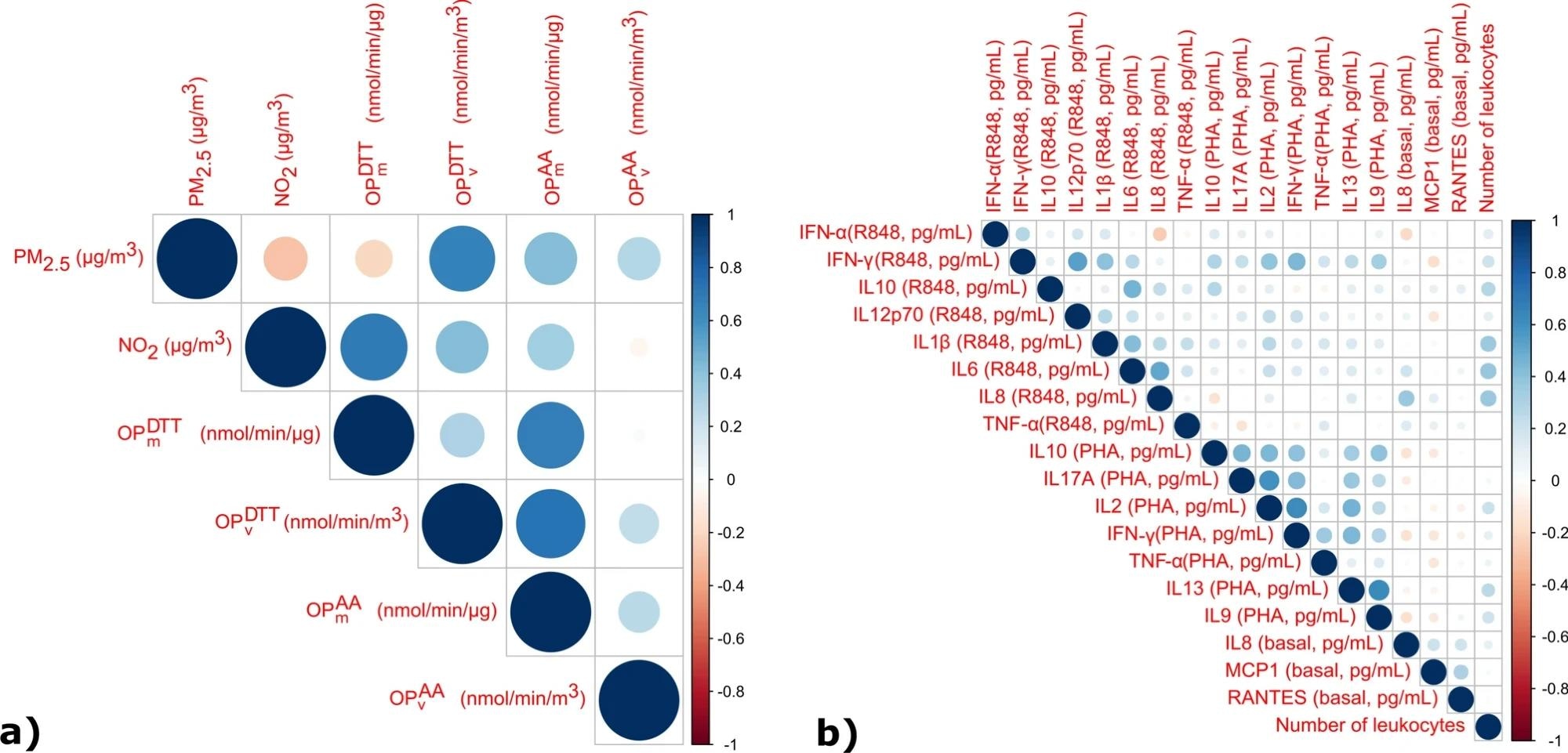 Pairwise Pearson’s correlations between air pollutants (a). Pairwise Pearson’s correlations between cytokines (imputed, corrected and log-10 transformed) and number of leukocytes (b). The Pearson correlation coefficients are indicated using a scale of size and color only when the p-values were less than 0.05. Abbreviations: PM2.5 particulate matter with diameter ≤ 2.5 μm; NO2 nitrogen dioxide; OP: oxidative potential; DTT: dithiothreitol; AA: ascorbic acid; IL interleukin; IFN interferon; TNF tumor necrosis factor; RANTES regulated on activation, normal T cell expressed and secreted; MCP monocyte chemoattractant protein; PHA phytohemagglutinin; R848 resiquimodPairwise Pearson’s correlations between air pollutants (a). Pairwise Pearson’s correlations between cytokines (imputed, corrected and log-10 transformed) and number of leukocytes (b). The Pearson correlation coefficients are indicated using a scale of size and color only when the p-values were less than 0.05. Abbreviations: PM2.5 particulate matter with diameter ≤ 2.5 μm; NO2 nitrogen dioxide; OP: oxidative potential; DTT: dithiothreitol; AA: ascorbic acid; IL interleukin; IFN interferon; TNF tumor necrosis factor; RANTES regulated on activation, normal T cell expressed and secreted; MCP monocyte chemoattractant protein; PHA phytohemagglutinin; R848 resiquimod