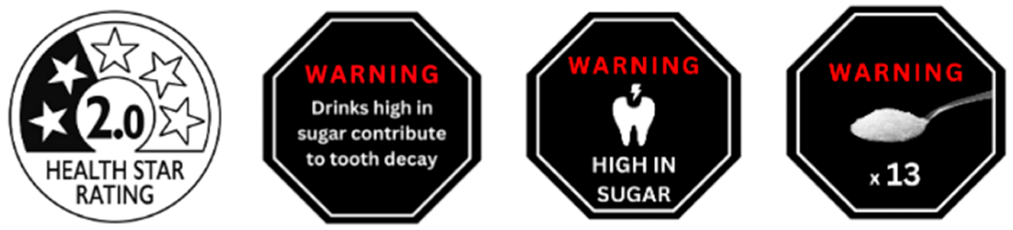 The four labels used were the text label “WARNING: Drinks high in sugar contribute to tooth decay,” a picture suggesting tooth decay with the text “WARNING and HIGH IN SUGAR,” the number of teaspoons of sugar equivalent to the drink with the text “WARNING,” or the HSR. The latter was present on all drinks, showing different stars depending on the sugar content.