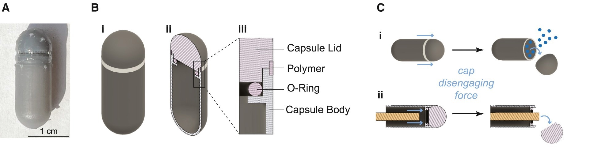 (A) PRIM device sealed with ROS-responsive polymer adhesive coating. (B) Schematic of (i) the 00 capsule-sized PRIM device, (ii) cross-section of the PRIM device showing the capsule lid and the hollow chamber that is filled with dye, and (iii) inset of the cross-section showing how an O-ring is used to form a seal between the capsule body and lid and where ROS-responsive dextran is filled into a notch to adhere the lid and body together. (C) Schematic of (i) PRIM device mechanism design for cap detachment and dye release and (ii) experimental measurement of cap disengaging force using a rod to push off the cap.(A) PRIM device sealed with ROS-responsive polymer adhesive coating. (B) Schematic of (i) the 00 capsule-sized PRIM device, (ii) cross-section of the PRIM device showing the capsule lid and the hollow chamber that is filled with dye, and (iii) inset of the cross-section showing how an O-ring is used to form a seal between the capsule body and lid and where ROS-responsive dextran is filled into a notch to adhere the lid and body together. (C) Schematic of (i) PRIM device mechanism design for cap detachment and dye release and (ii) experimental measurement of cap disengaging force using a rod to push off the cap.
